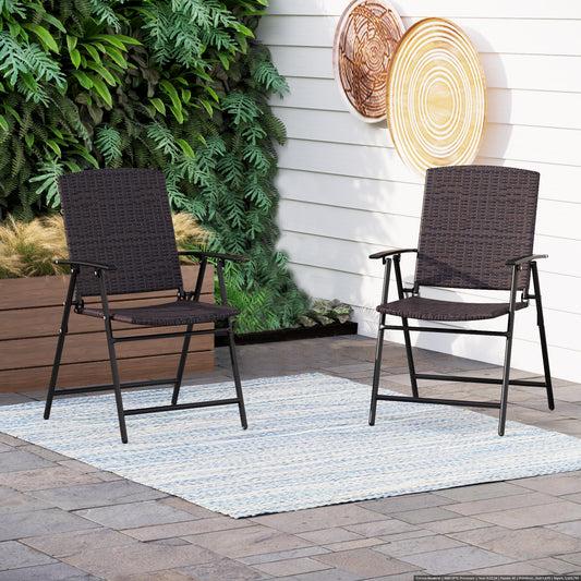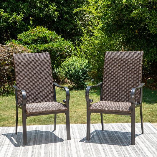 PHI VILLA Rattan Metal Patio Dining Chairs, Set of 2Material: High-back Chairs: natural-look PE rattan (similar to the real wicker, which is a bit rough); metal steel Size: High-back Chairs: Seat Height: 15.75”; Seat Width: 19.7”; Armrest Height: 24.8”; Total Height: 41.35" Load capacity: 350 LBSDetails: Premium Rattan Chair: Selective tightly woven weather-resistant resin rattan and durable...
