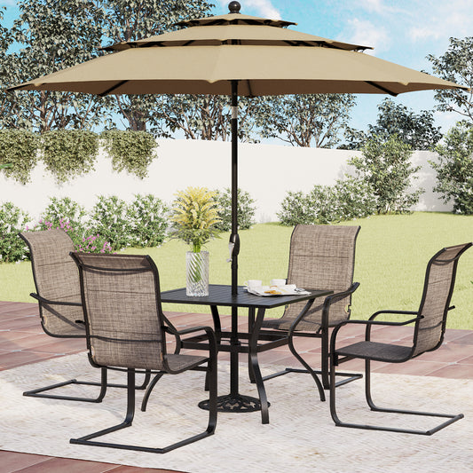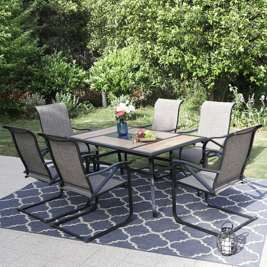 MFSTUDIO Wood-look Square Table & 4 Textilene C-spring Chairs 5-Piece Outdoor Dining SetTable:Materials: Metal Steel, PVC PlasticDimension: 37" L x 37" W x 28" HColor: Black Chairs:Size: shown in the pictureMaterial: steel frame/mesh fabric seat and back, padded foam.Color: black(frame)/grey-brown (fabric) COMFORTABLE DESIGN: These 15°slightly rocking design chairs will bring you most comfort and relax. The ergonomic back support...