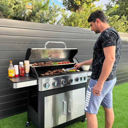Captiva Designs 4-Burner Outdoor Propane Gas BBQ Grill with Side BurnerGet perfect grilling results with our 4 burner gas grill with side burner. Designed for outdoor use, this propane gas grill features wide fire sub-boards for even heat distribution and four powerful 8,000 BTU burners to prevent flare-ups. Perfect for BBQ dinners for 6-8...