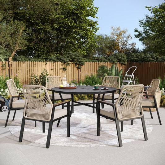 PHIVILLA 7-Piece Outdoor Dining Set with HDPE Rattan Chair and Wood-grain TableUpgrade your outdoor gatherings with this 7-piece dining set, designed for durability, comfort, and timeless style. Crafted with premium HDPE and handwoven Wicker King™ rattan, it resists UV, fading, and moisture, ensuring long-lasting beauty in any season. Paired with plush all-weather cushions and a...