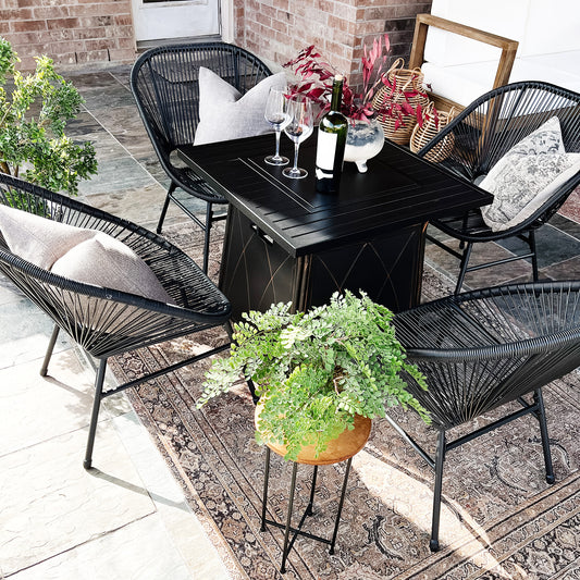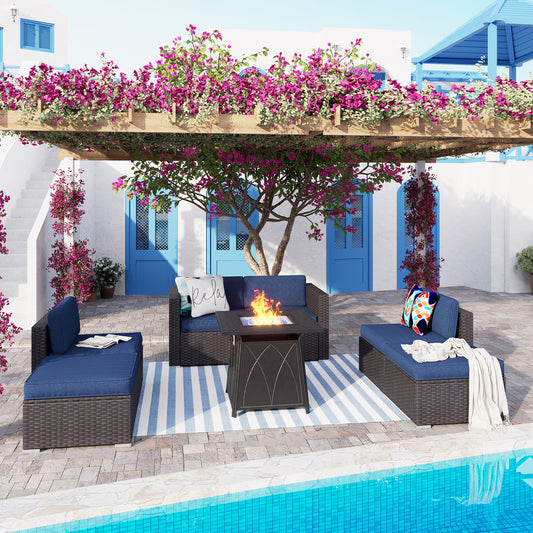 PHI VILLA 5-Seat Rattan-steel Luxury Padded Patio Conversation Set with Fire Pit TableDimensions: Three-seat Sofa: 74.8"L x 31.3"W x 35"H Fixed Chair: 27"L x 31.3"W x 35"H Square Fire Pit Table: 32"L x 32"W x 24.75"H Note: Assembly is required for this set. The order will be divided into 3-4 packages. Details: Sturdy Construction: The patio conversation set features...