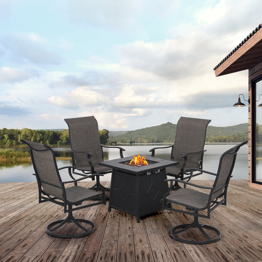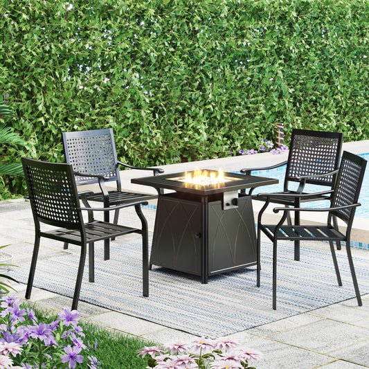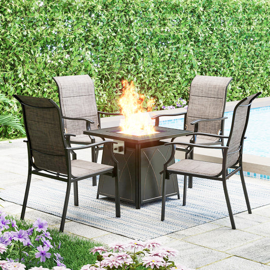 Sophia & William 5-Piece Gas Fire Pit Patio Dining Set Wood-look Gas Fire Pit Table 50,000 BTU & 4 C-spring Cushioned Chairs - BeigeMaterial: C-Spring Chair: Durable wrought iron frame and 3.9" thickness cushion Table: Metal Steel Size: Table (approximately) : 34" x 34" x 25" C-Spring Chair: Seat Height: 13.8”; Seat Width: 25.4”; Cushion Thickness: 3.9”; Total Height: 34.8” Weight Capacity: 300 lbs Standard 20 lbs LP...