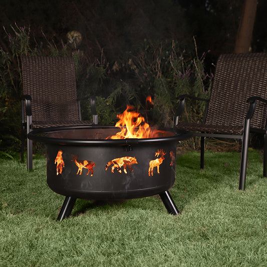 PHI VILLA 30" 2-In-1 Moon & Star Pattern Patio Fire Pit with Grilling GridFrame Color: black painting with bronze finishDimension: Shown in the pictureMaterial: Steel Details: Excellent Ventilation Effect: The special star & moon pattern of the basin body has a reasonable size that ensures a certain ventilation effect. It avoids the defects of other designs on the market, such as...
