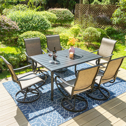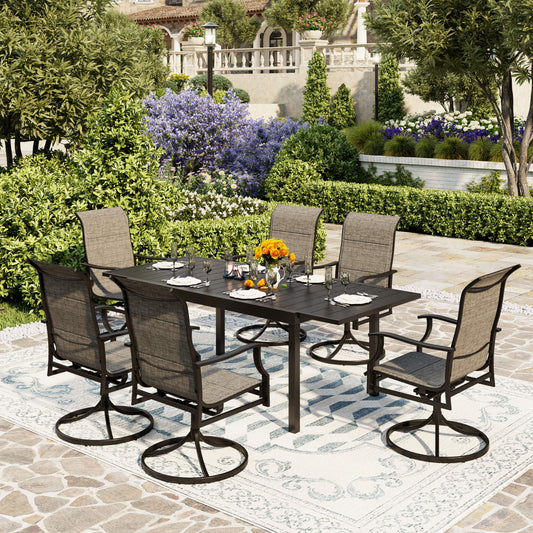 PHI VILLA Rectangle Table and 6 Textilene Swivel Chairs 7-Piece Steel Outdoor Dining SetChairs: Material: Metal Steel & TextileneWeight Capacity: 300 lbs Table: Color: BlackMaterial: Metal Steel Package Included: 1 Table and 6 Chairs Features: Sturdy Steel Construction: Built to withstand the elements, this dining set features a robust e-coated steel frame that ensures long-lasting durability and stability....