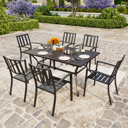PHIVILLA Rectangle Patio Table and 6 Stackable Chairs 7-Piece Metal Outdoor Patio Dining SetsSpecification:Color: BlackMaterial: Heavy-duty metal steelChair Size: 25.2"D x 22.8" W x 35"H, Seat Height:17"; Weight Capacity: 300 LBS.Table Size: 60.2"L x 37.8"W x 28"H; Diameter of umbrella hole:1.57".Package Included1 x rectangle table6 x Patio dining chairs1 x Instruction Classic Look: We have 5 kinds...