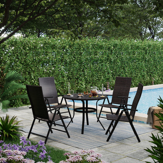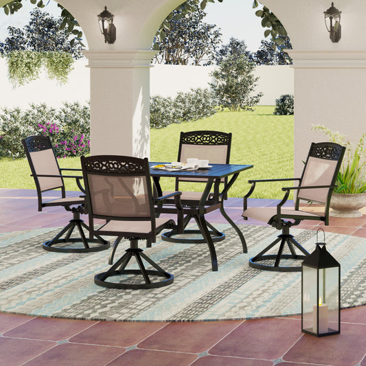 PHI VILLA 5-Piece Patio Dining Set Textilene Swivel Chairs & Geometrically Stamped Round TableOur round dining table has a unique split-joint design on the top, adding sophistication and style to your outdoor dining area. This 360° swivel chair boasts an ergonomic design that supports your body's natural contours, providing optimal comfort during long meals or gatherings. The chair's Textilene...