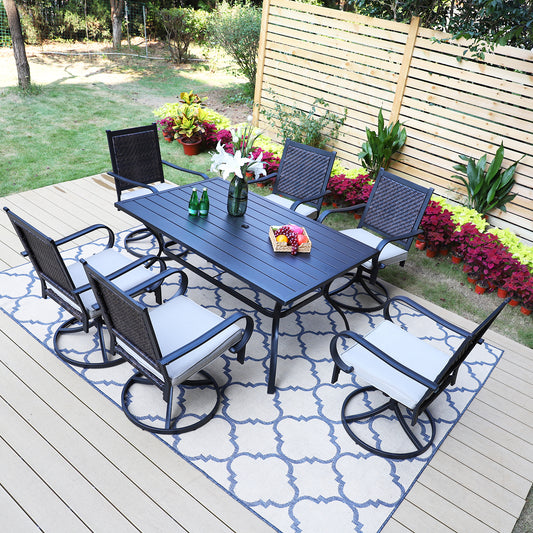 PHI VILLA Rectangle Steel Table and Swivel Chairs 7-Piece Patio Dining SetsSpecification:Color: BlackMaterial: Heavy-duty metal steelStackable Chair Size: 25.2"D x 22.8"W x 35"H, Seat Height:17"; Weight Capacity: 300 LBS.Swivel Chair Size: 18"D x 20"W x 35"H, Seat Height:15"; Weight Capacity: 300 LBS; Cushion Thickness: 2.7".Table Size: 60.2"L x 37.8"W x 28"H; Diameter of umbrella hole:1.57".Package...