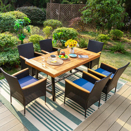 PHI VILLA 7-Piece Rattan Steel Cushioned Patio Chairs & Steel Panel Table Outdoor Dining SetSize: Table: 60"L x 35"W x 29"H Crescent Chairs: Seat Height Without Cushion: 16.7”; Seat Width: 19.7”; Armrest Height: 24.4”; Total Height: 34.4” Material: Crescent Chairs: PE Rattan & Steel Table: Steel Details: Premium Rattan Chair: Selective tightly woven weather-resistant resin rattan and durable powder-coated steel frame offer...