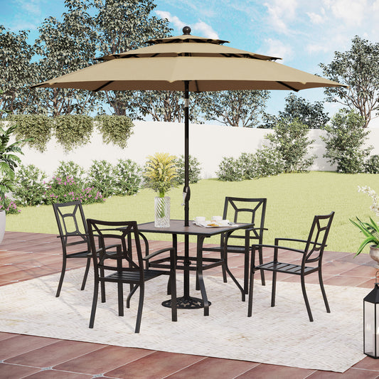 Packages Included:1 Table, 4 chairs and 1 patio umbrella & all the hardware needed for installation.Table:Materials: Metal Steel; PVCDimension: 37" L x 37" W x 28" HColor: Black Chairs:Material: Metal SteelWeight capacity: 300 lbsColor: BlackUmbrella (Umbrella Base Not Included):Size: 10 ftFabric: 180 G Polyester...