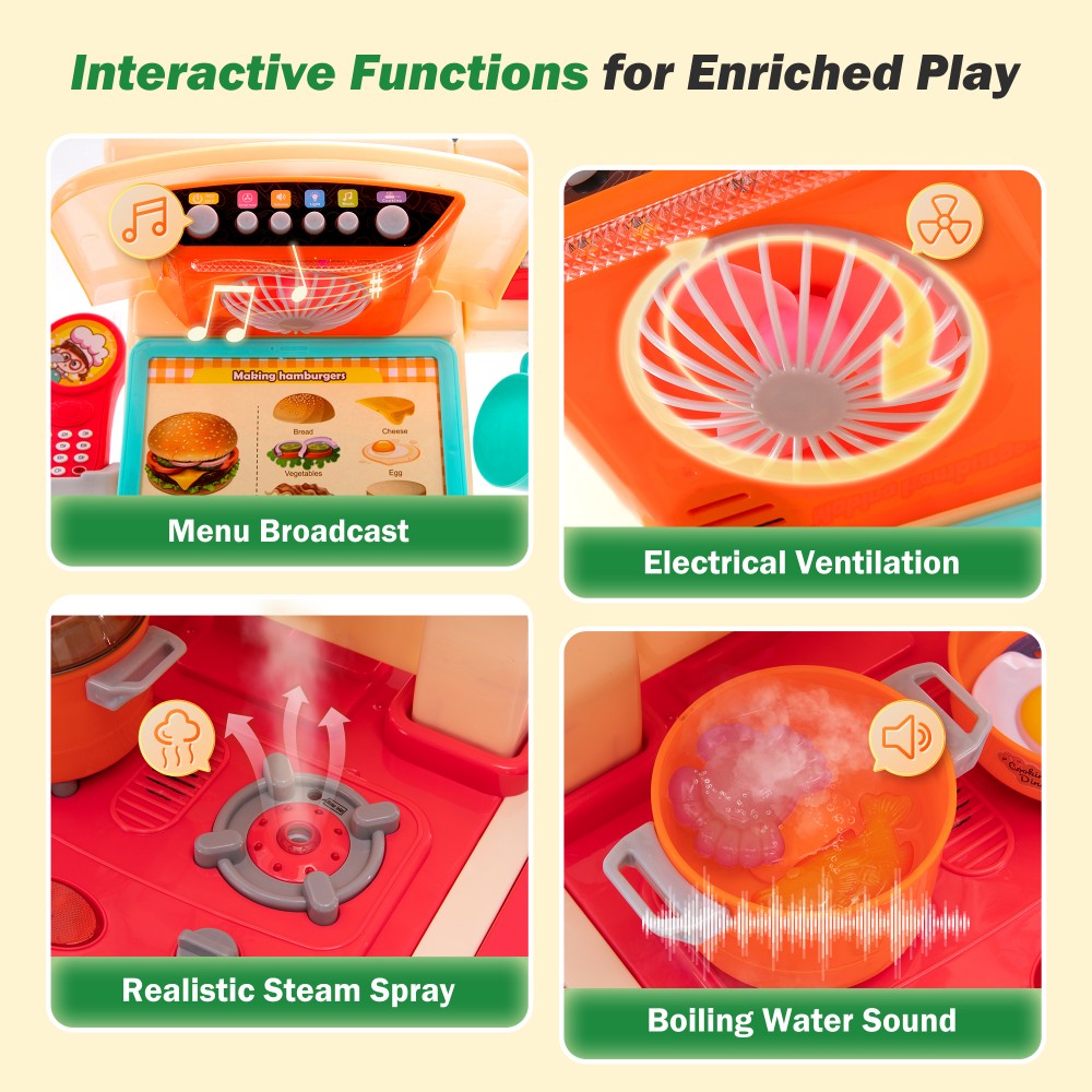 Turn playtime into a fun cooking adventure with our Interactive Play Kitchen for Toddlers. This all-in-one set includes a microwave, oven, stove, sink with running water, vent fan, and drink dispenser—creating a complete kitchen scene for kids to role-play like real chefs.