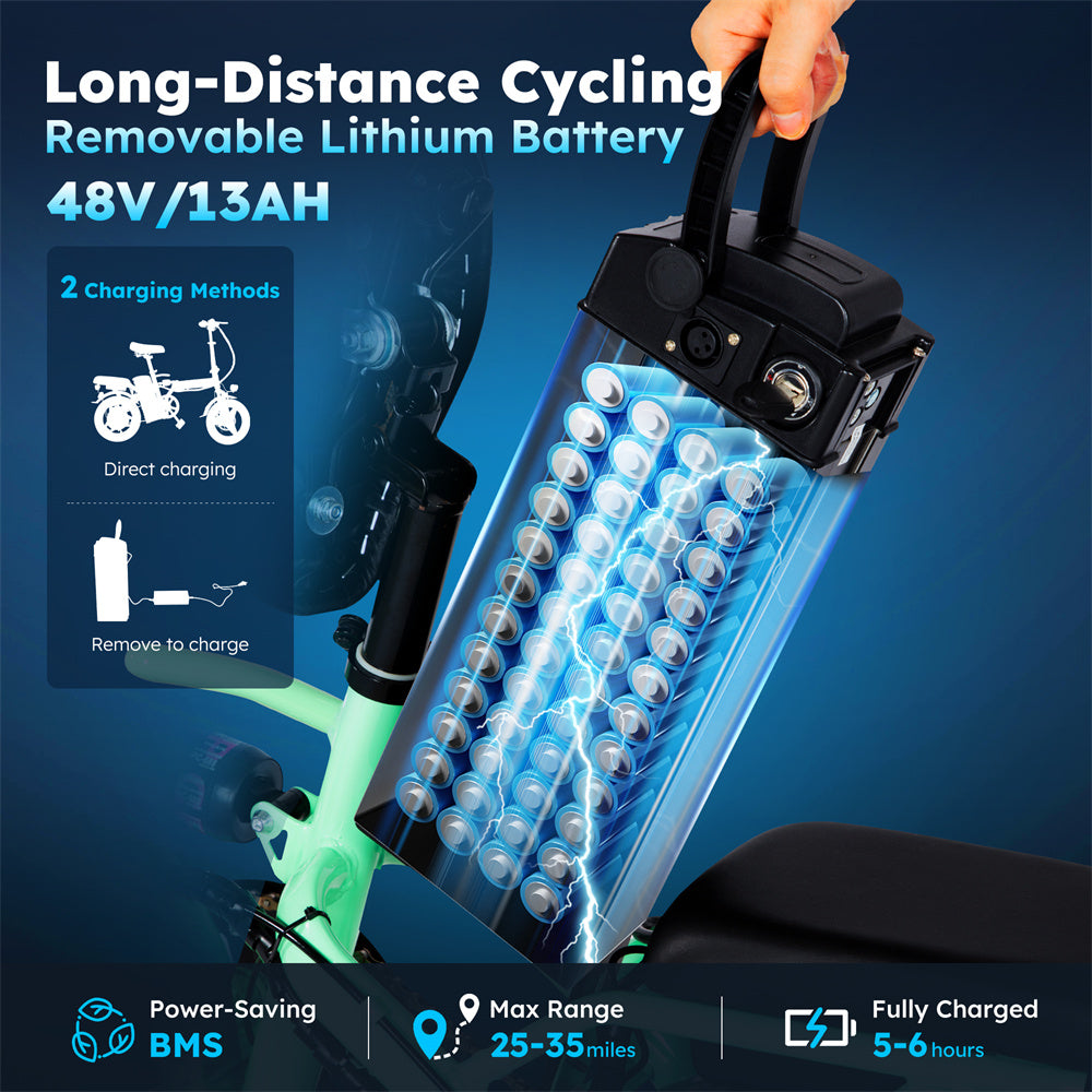 Unleash your adventurous spirit with our electric bike, powered by a robust 48V 13Ah lithium battery that only takes 5 to 6 hours to fully charge, giving you the freedom to explore without limits. With three versatile riding modes at your fingertips—pure electric, pedal-assist, or traditional cycling—you can effortlessly transition from winding city streets to rugged trails. Designed for comfort and durability, it features a plush high-density foam seat and a foldable aluminum frame, making it easy to carry on any journey, ready to conquer whatever awaits you! Plus, it's perfect for those with limited mobility, ensuring that everyone can share in the joy of exploring the great outdoors together.