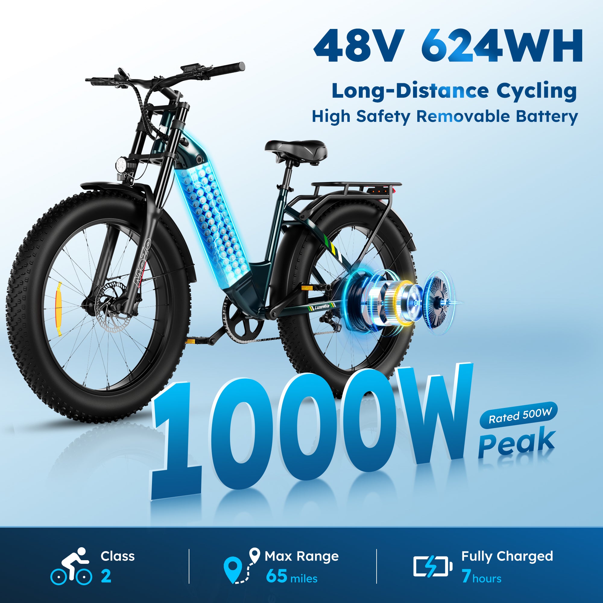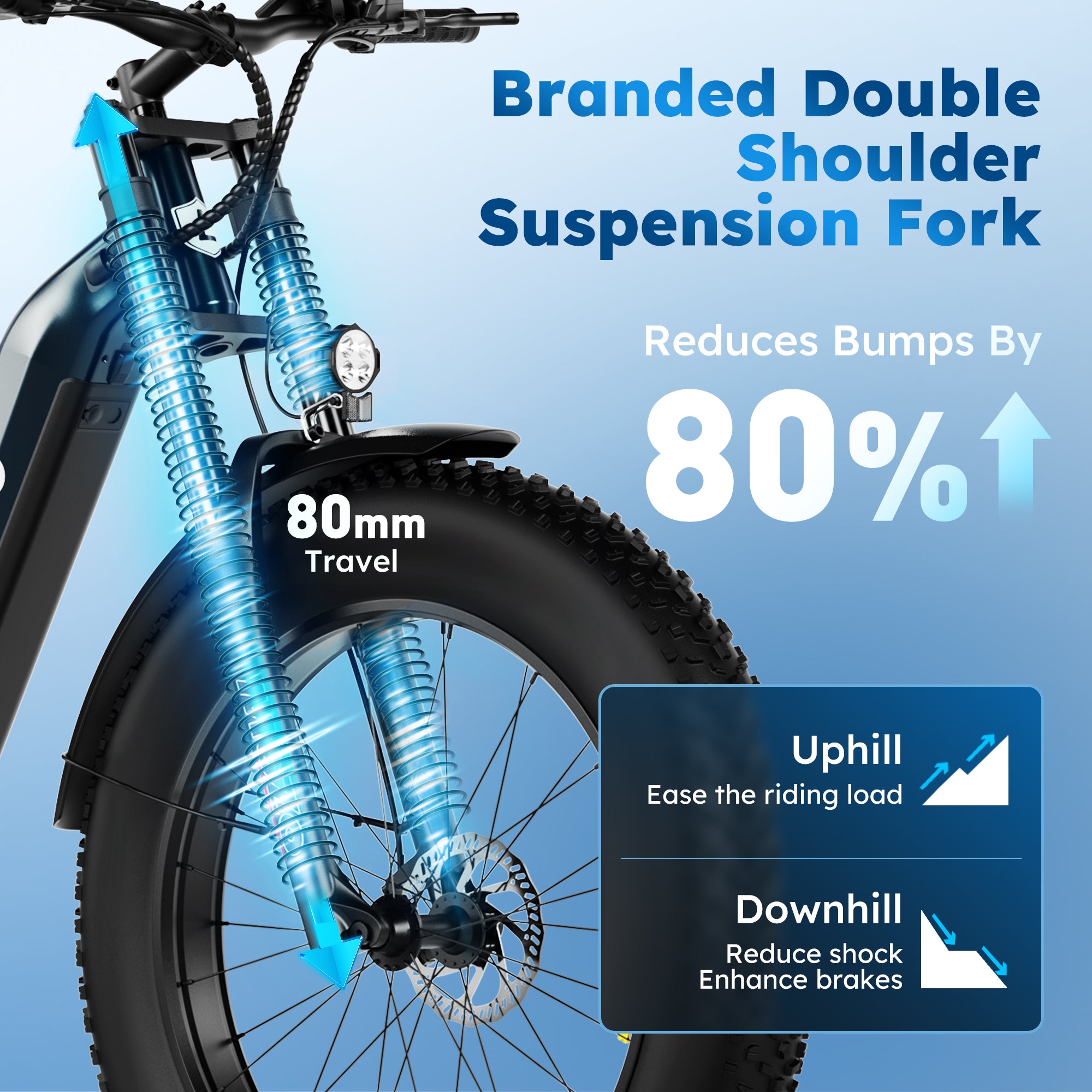 Alpha Camp Electric Bicycle, your new partner for thrilling adventures! With a powerful peak 1000W motor, this bike offers an impressive 65 miles of maximum range, ensuring you can explore more without worrying about running out of power. Equipped with 7-speed professional gears, you can easily tackle any hill. The durable hydraulic disc brakes provide unmatched safety, while the branded double shoulder suspension fork smooths out bumps for a comfortable ride.