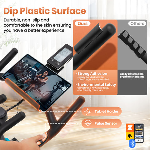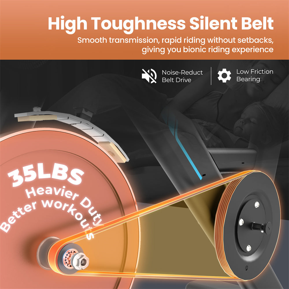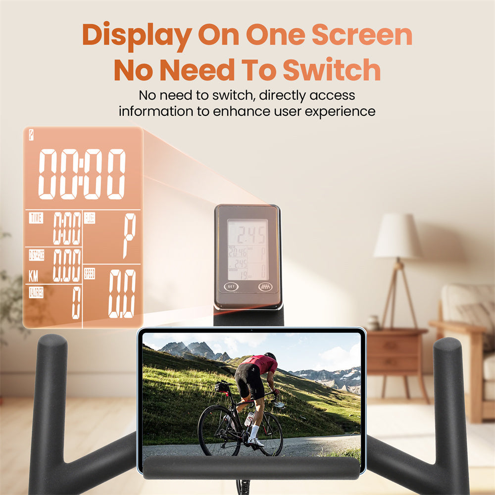 Elevate your fitness journey with our dynamic exercise bike, crafted from a sturdy steel frame and featuring a robust 30-pound flywheel that promises unmatched stability and durability for your most intense rides. With its ultra-quiet belt drive system, you can enjoy a smooth, whisper-quiet workout while staying focused on your goals without disturbing anyone around you. The upgraded large-screen digital monitor keeps you on track by displaying real-time data on your time, speed, distance, and calories burned, while the ergonomic, padded seat and convenient tablet holder allow you to immerse yourself in music or videos, making your workout experience truly enjoyable!