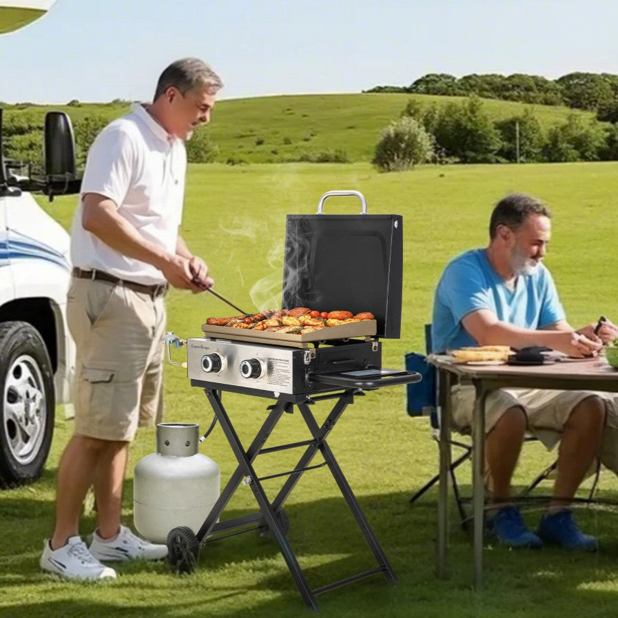 Upgrade your outdoor cooking with our 2-in-1 Portable Griddle & Tabletop Grill! Designed for versatility and power, this lightweight griddle combines 20,000 BTU stainless steel burners with a detachable, rust-resistant griddle top that heats instantly. Perfect for camping and backyard BBQs, it folds in seconds, connects to any propane tank (1LB or 20LB), and delivers professional-grade performance—all while saving space and effort.