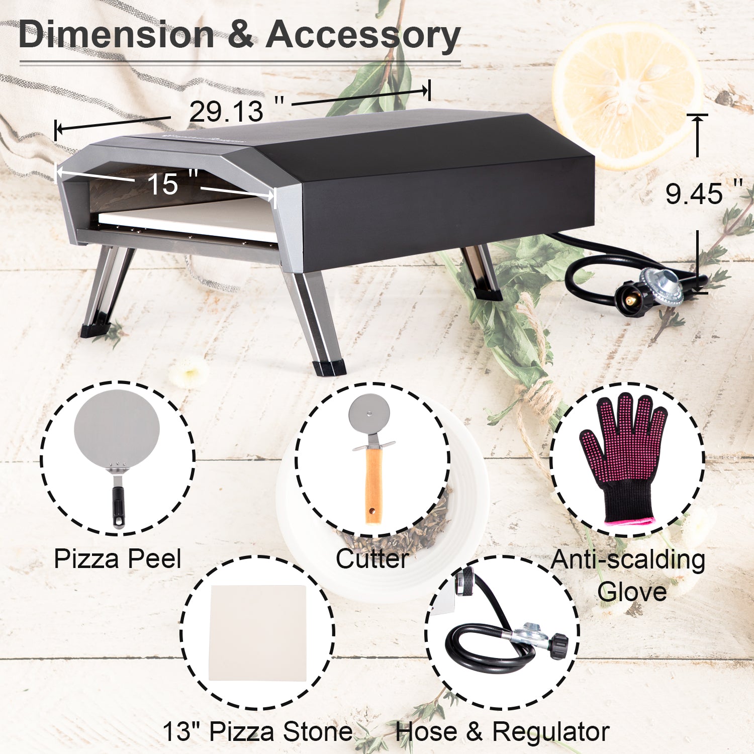 Accessories: a 13" x 13" pizza stone, a scald-proof glove, an SS430 pizza peel, an SS430 cutter, and a hose with regulator
