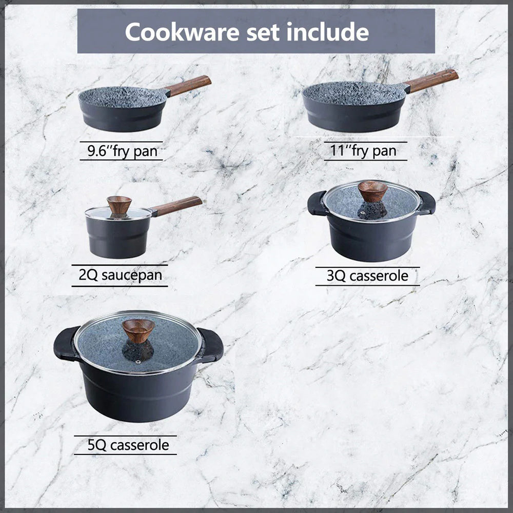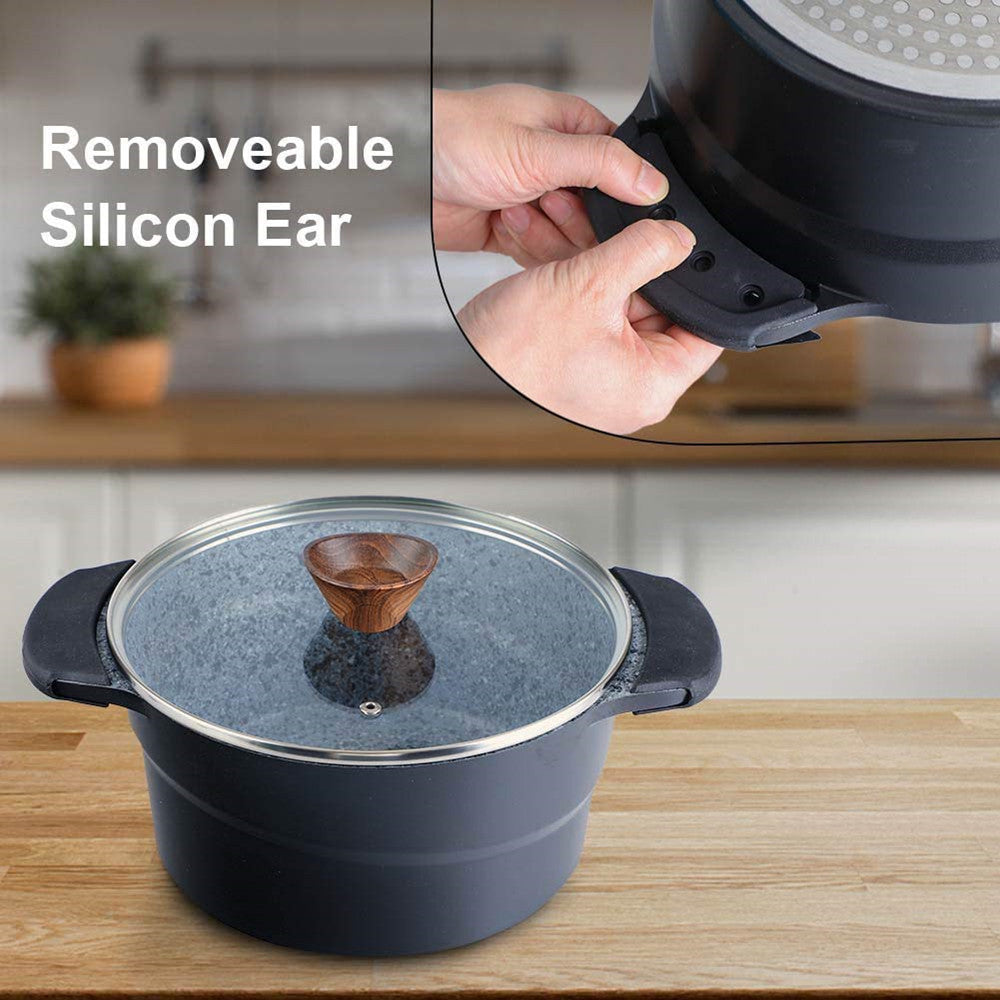 Pack List: 9.6-inch fry pan / 11-inch fry pan / 2qt saucepan with lid / 3qt casserole with lid / 5qt casserole with lid / 4 pcs Silicon Ears