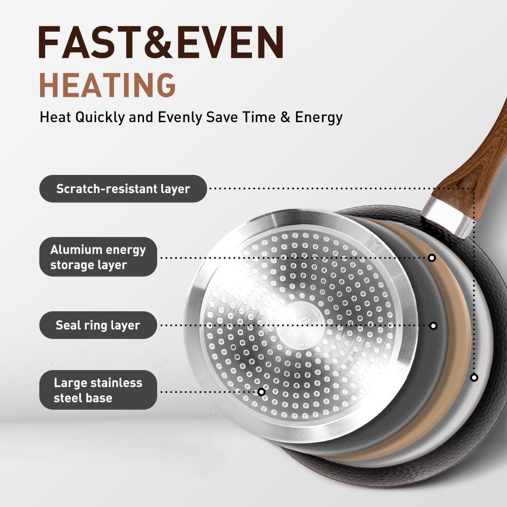 This cookware set features a stylish hammered finish that combines modern aesthetics with functionality, making it perfect for gifting during the Thanksgiving and Christmas holidays. The graniteware coating ensures exceptional nonstick capability, preventing food from sticking with ease. Plus, it's free from lead, PFOS, and PFOA, and comes with heat-resistant bakelite handles for safe and comfortable cooking.