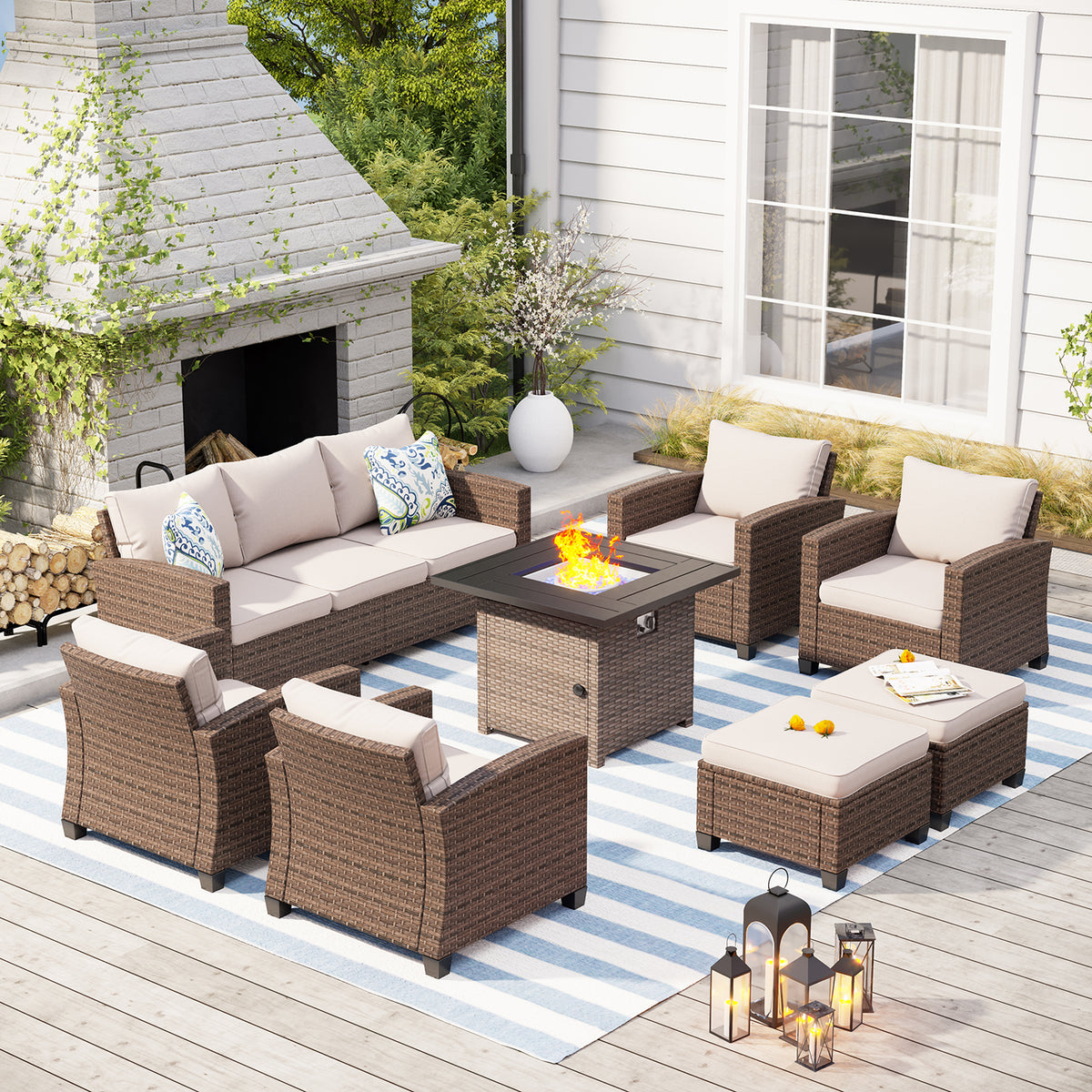 Ideal for any setting, the plump cushions provide ultimate comfort. The CUSHION PROTM fabric resists water, oil, and stains. Add warmth with our CSA-certified propane fire pit, featuring easy ignition and adjustable flames, complemented by included blue fire glass, for a cozy, vibrant atmosphere during gatherings or poolside lounging. Elevate your outdoor space with our weather-resistant WICKER KINGTM rattan and sturdy steel furniture.
