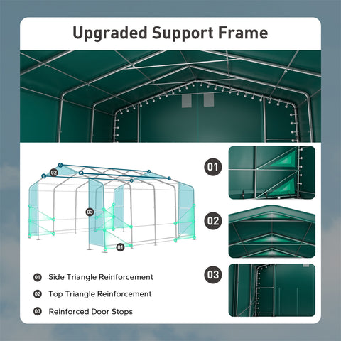 Transform your outdoor storage experience with our spacious and durable storage tent. Designed to withstand various weather conditions, its ample size provides the perfect solution for safely storing vehicles, equipment, and tools. With its upgraded appearance featuring roll-up doors and adjustable dividers, this tent not only meets your needs but also enhances the aesthetic of your outdoor space.