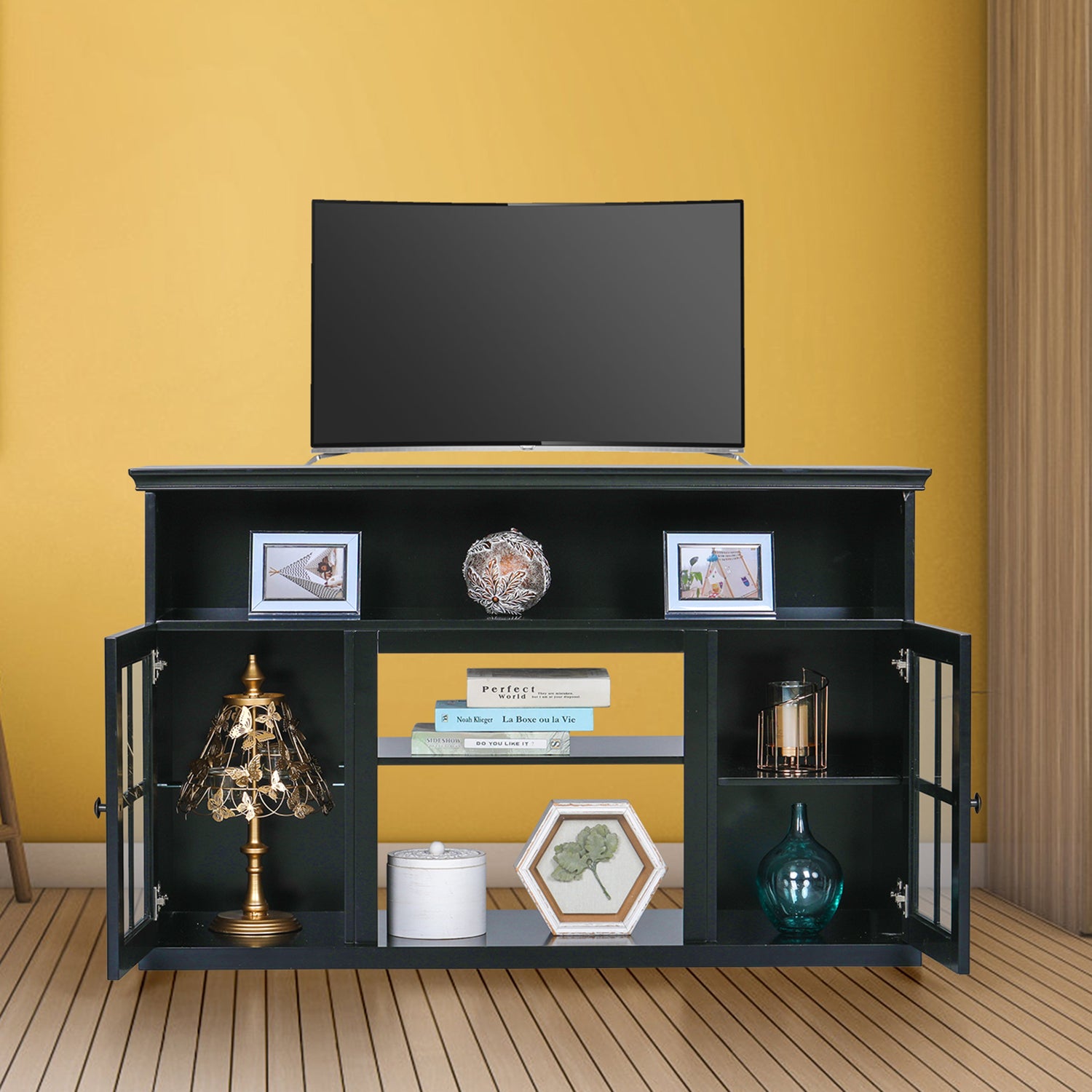 Large Storage Space: There are adjustable shelves in the storage space inside the two tempered glass doors, with an open shelf in the middle, so the fireplace can be removed in summer. With an open layer, various objects can be placed.