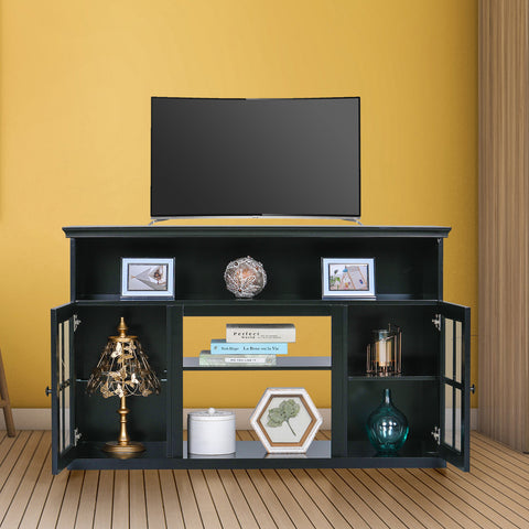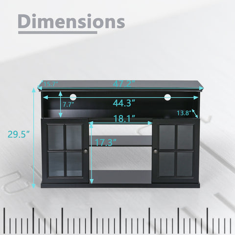 Material: High-grade MDF with premium painting+ 4mm tempered glass doors, the black woodgrain gives the TV Stand a clean, updated look.The TV Stand can hold up to 150 lbs.(In the case of placing an electric fireplace)