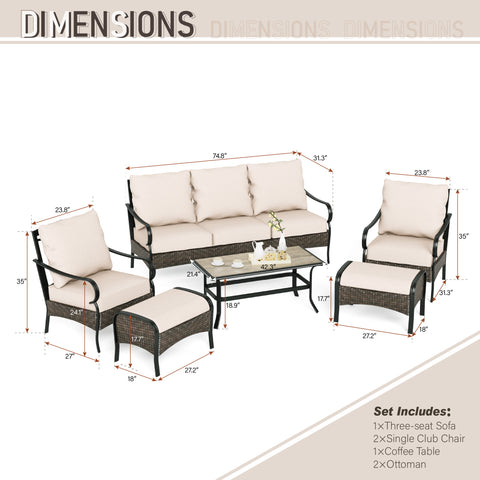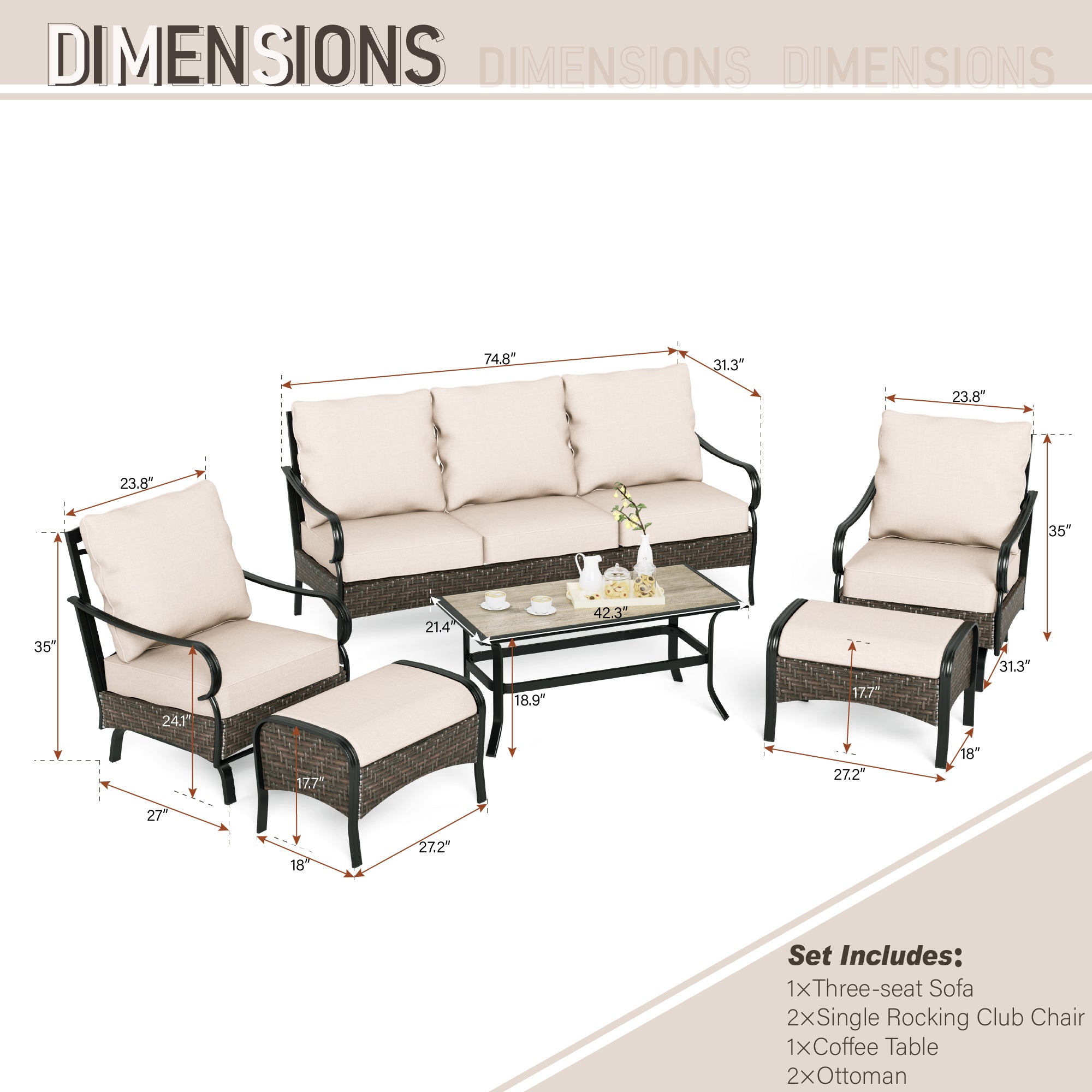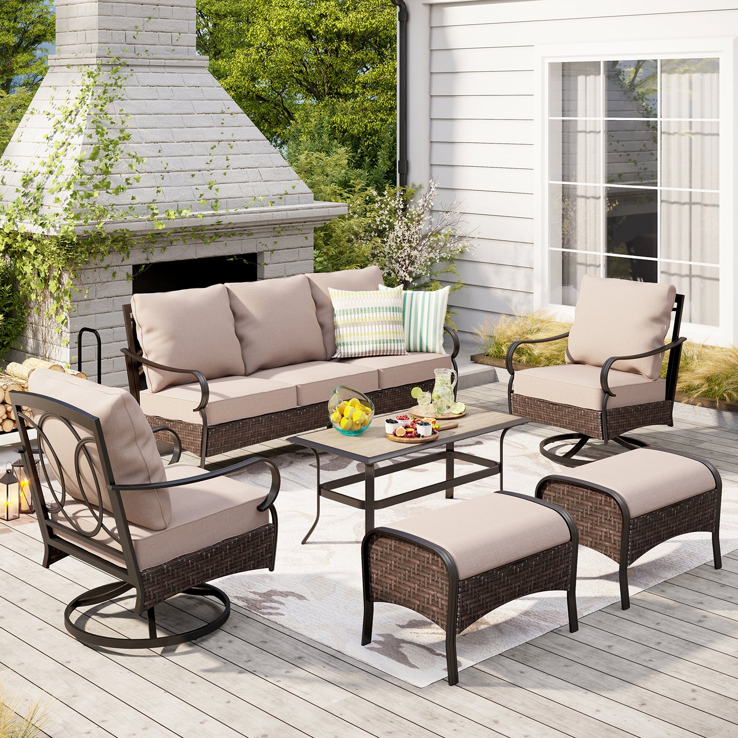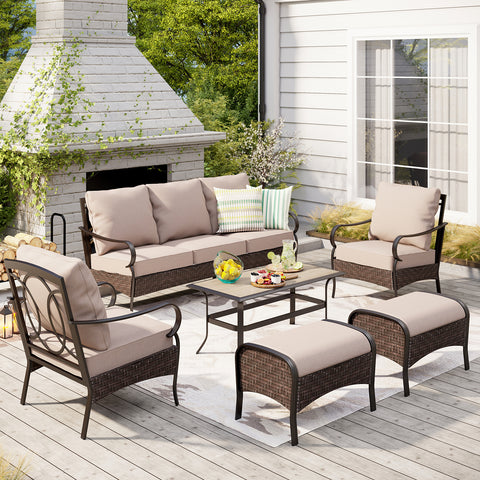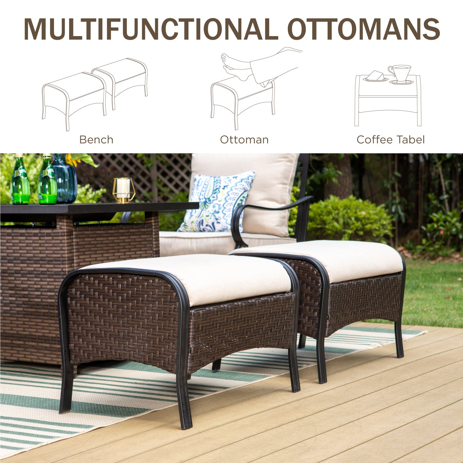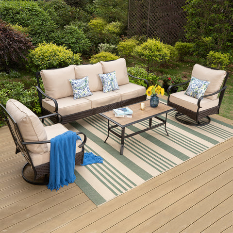 Seat cushions are filled with deform-resistant high-density sponges. Water-resistant cushion covers ensure easy cleaning and maintenance, enhancing your outdoor living experience with style and functionality. PE Rattan adds a natural and organic touch to the overall design of the steel furniture set without reducing its durability. The combination of steel, rattan & wood-like PVC creates a visually appealing contrast and adds texture to the furniture.