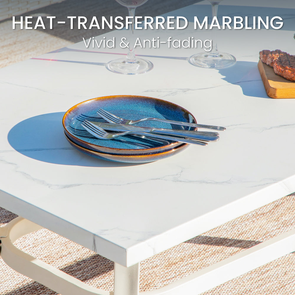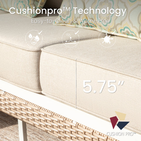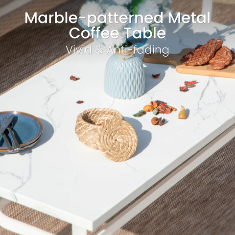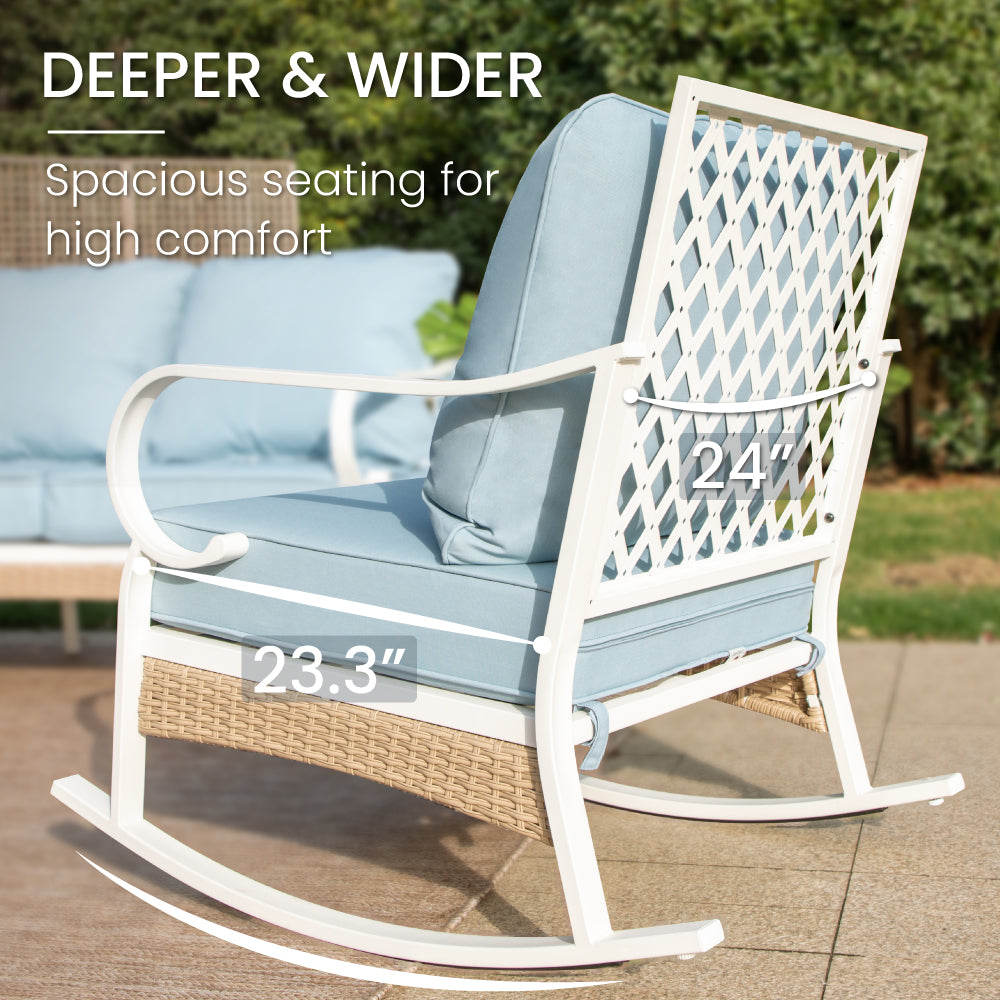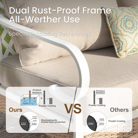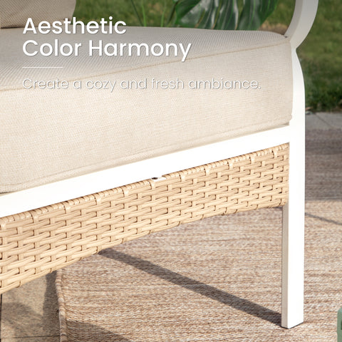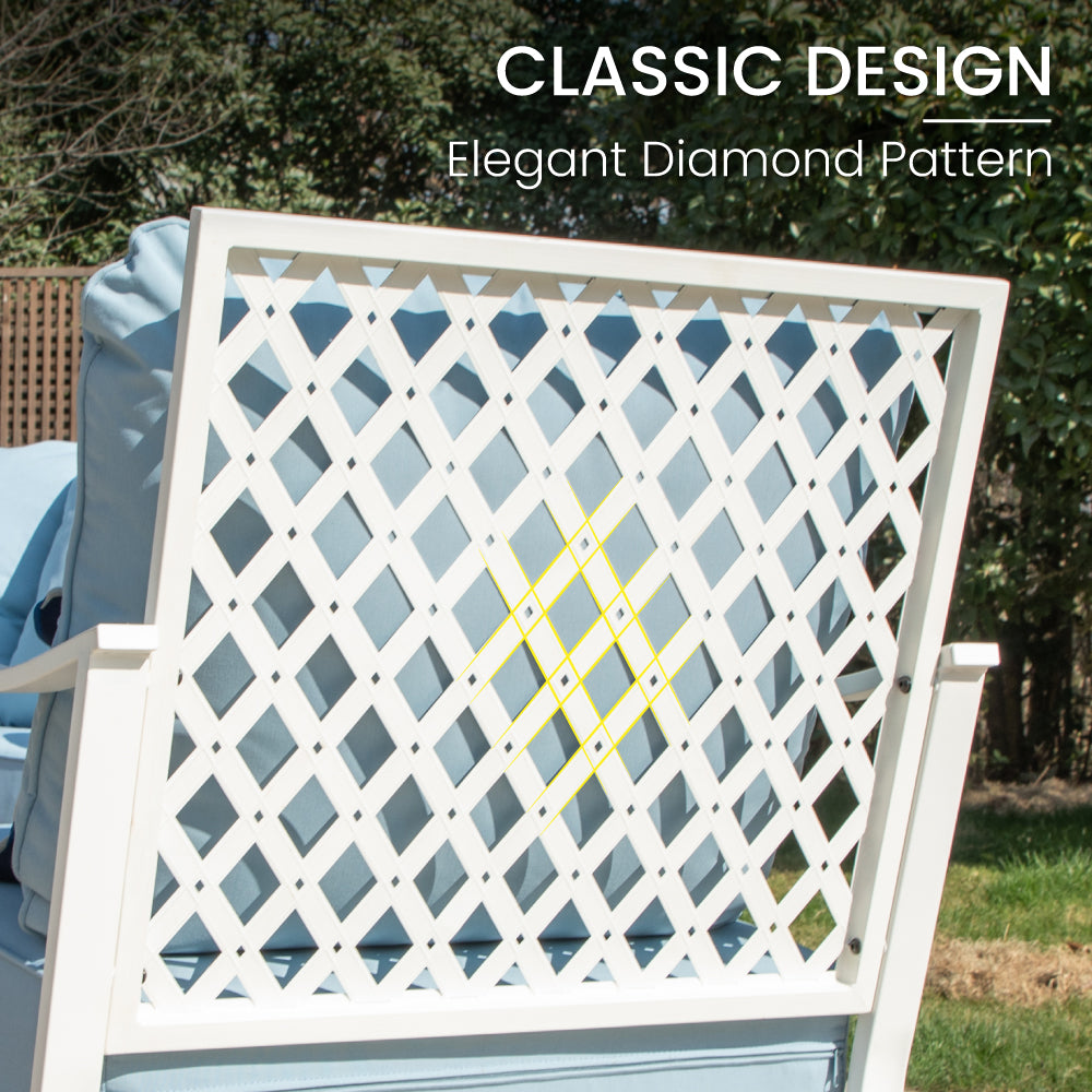 Revamp your outdoor gatherings with this luxurious and stylish sofa set, perfect for creating lasting memories with friends and family. The fresh color combination of porcelain white, tealish blue, and light brown makes this set truly stand out. Thick cushions ensure optimal comfort, while the meticulous attention to detail in crafting guarantees elegance, comfort, and functionality all in one.