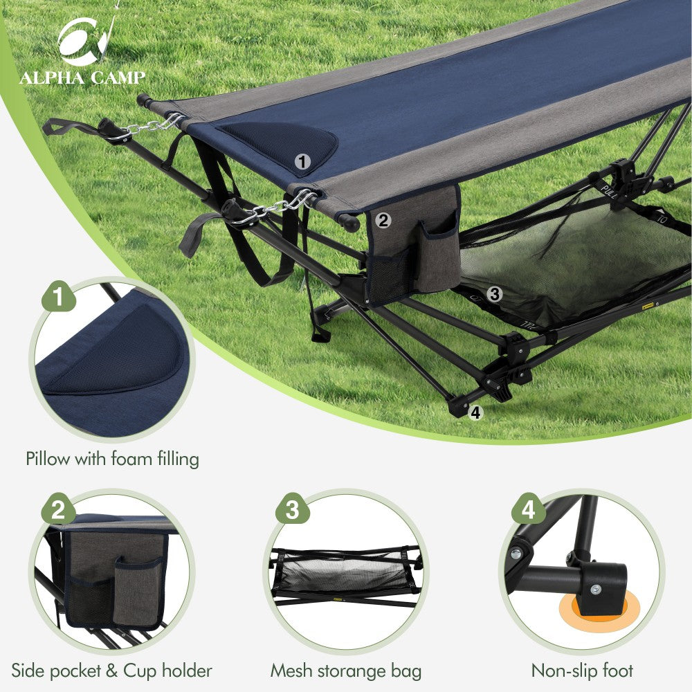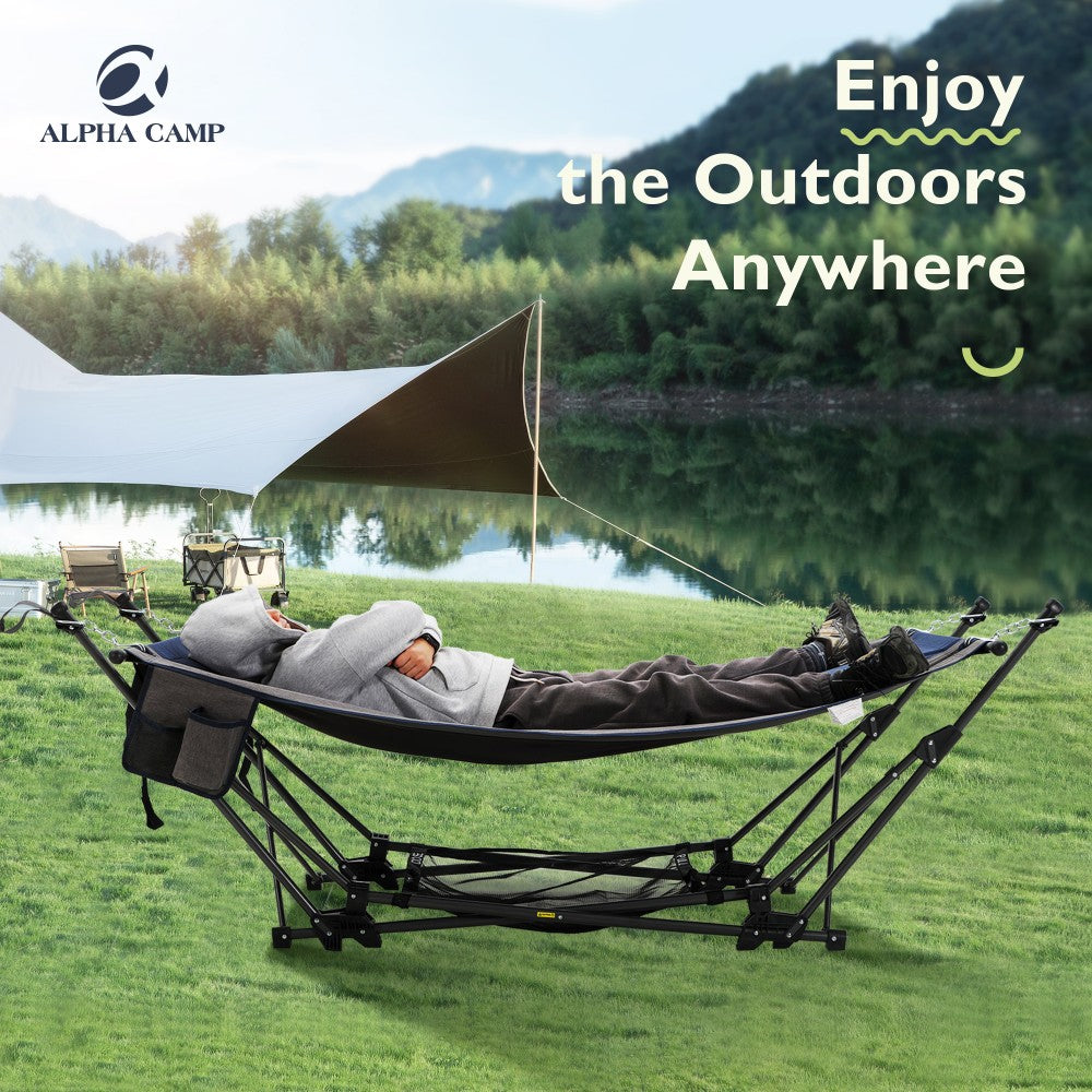 Relax anywhere with the ALPHA CAMP Portable Hammock Bed. Designed for comfort, safety, and convenience, this freestanding hammock comes with a sturdy X-shaped metal frame, non-slip feet, and supports up to 250 lbs, ensuring stability and durability wherever you use it.