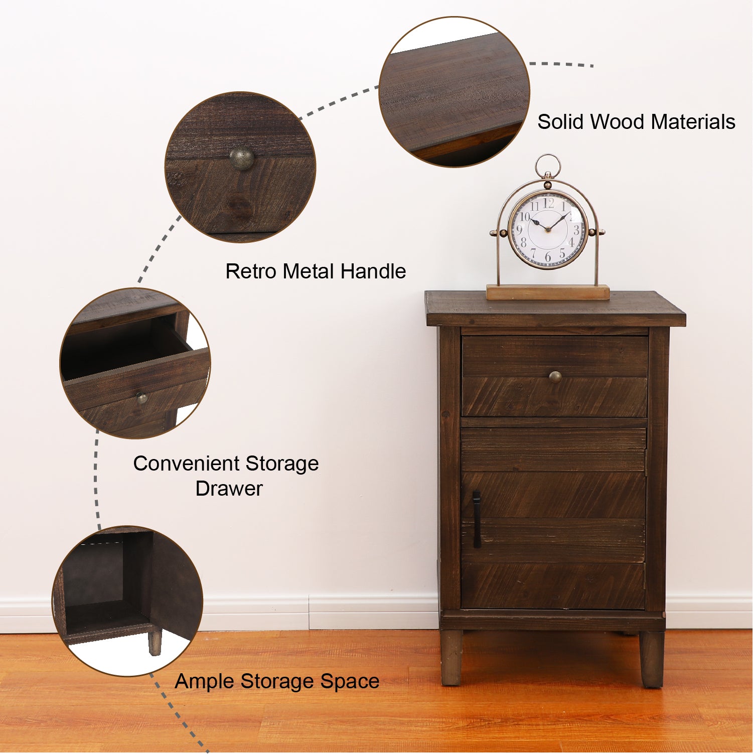 Retro Design: Smooth lines and dark brown color make our side table look vintage and concise.The metal handle on the drawers provide a retro feeling to the side table at the same time.