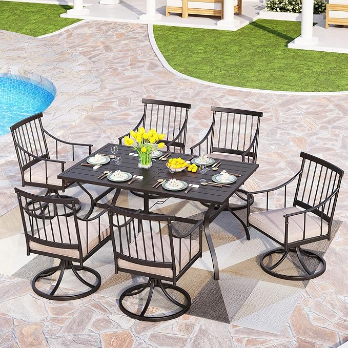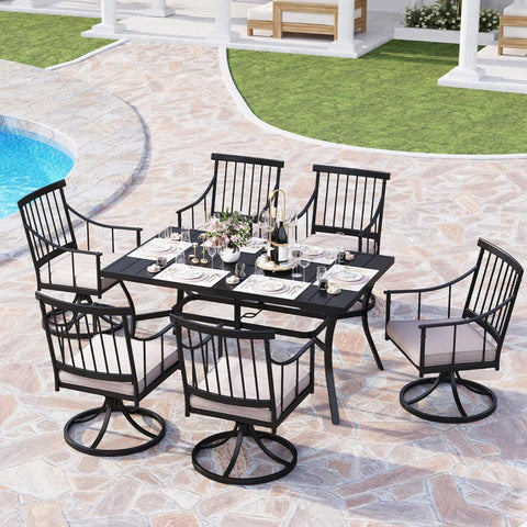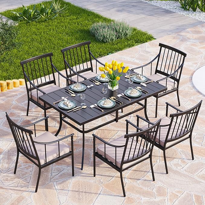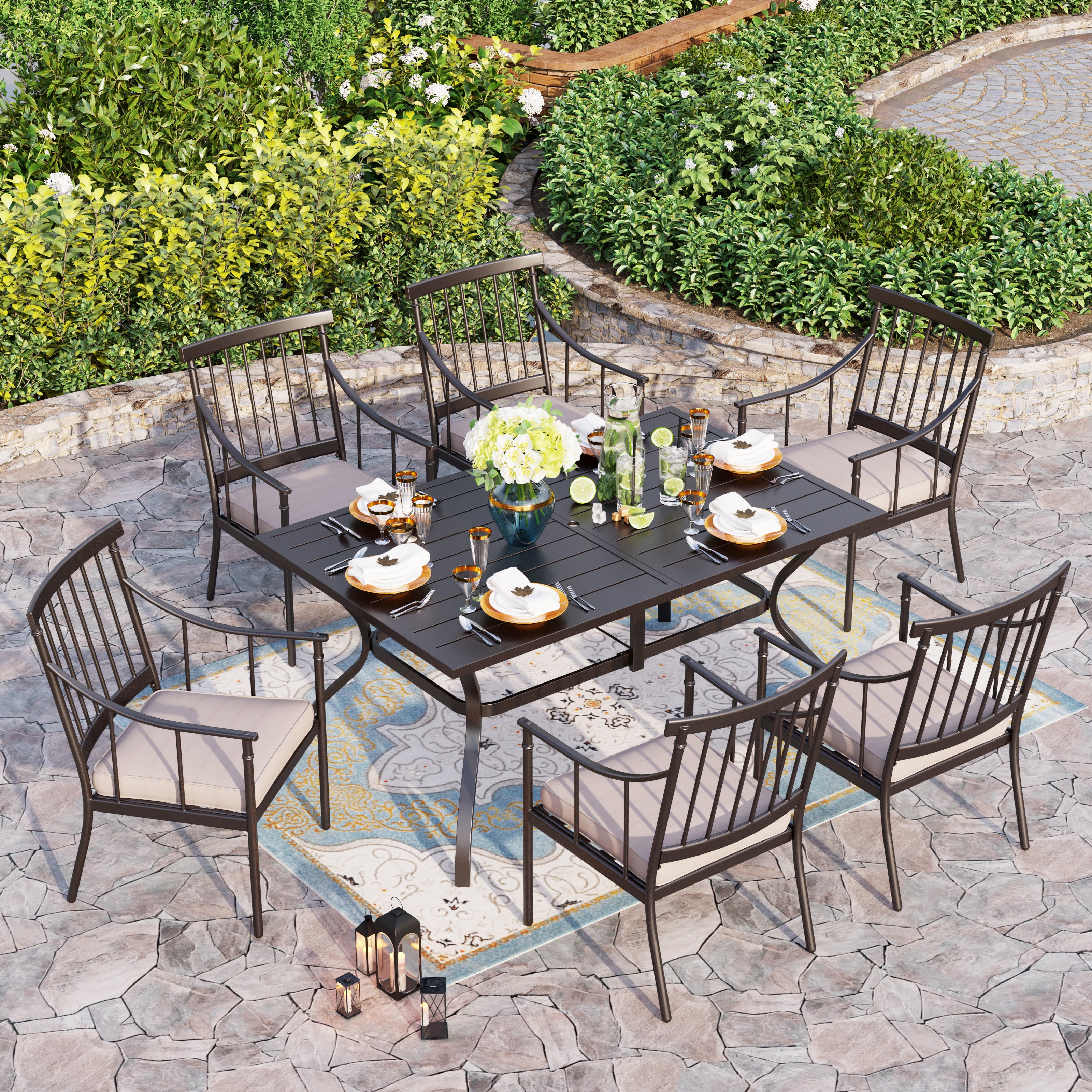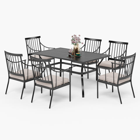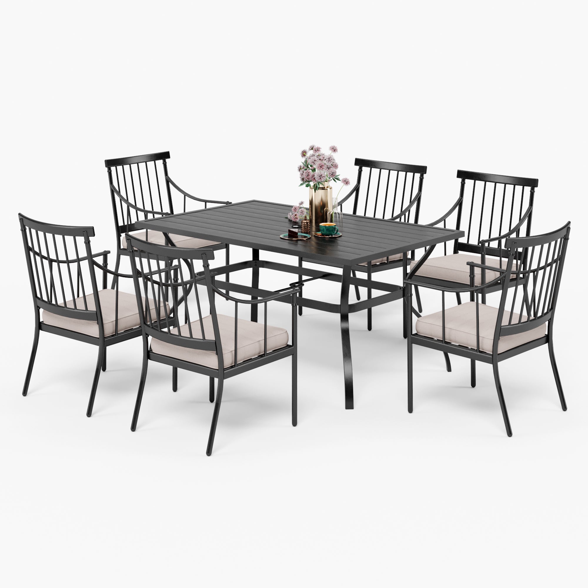 Upgrade your outdoor space with this stylish 7-piece dining set, featuring a durable steel table and six cushioned armchairs. Weather-resistant materials ensure long-lasting use, while curved armrests and thick cushions offer extra comfort. The spacious table seats six and includes a 1.57" umbrella hole—perfect for backyard meals and patio gatherings.