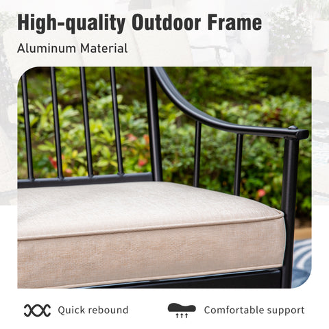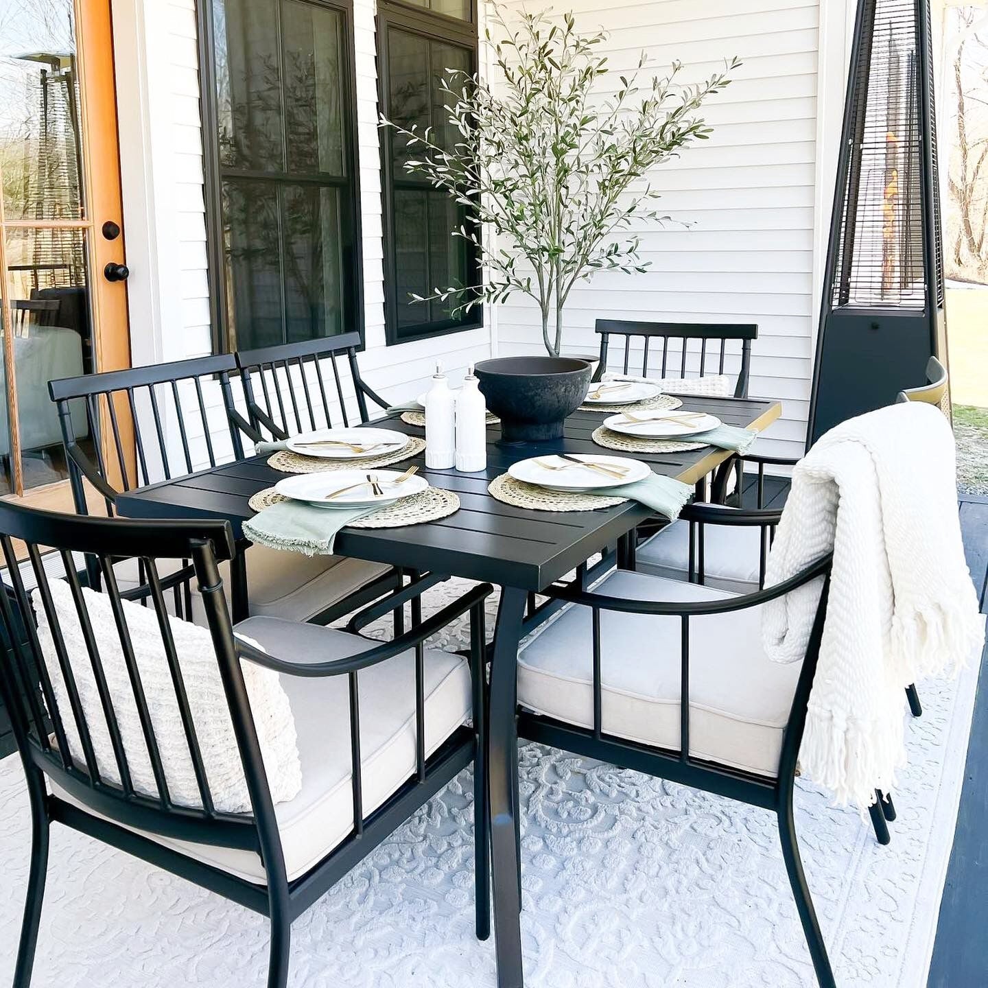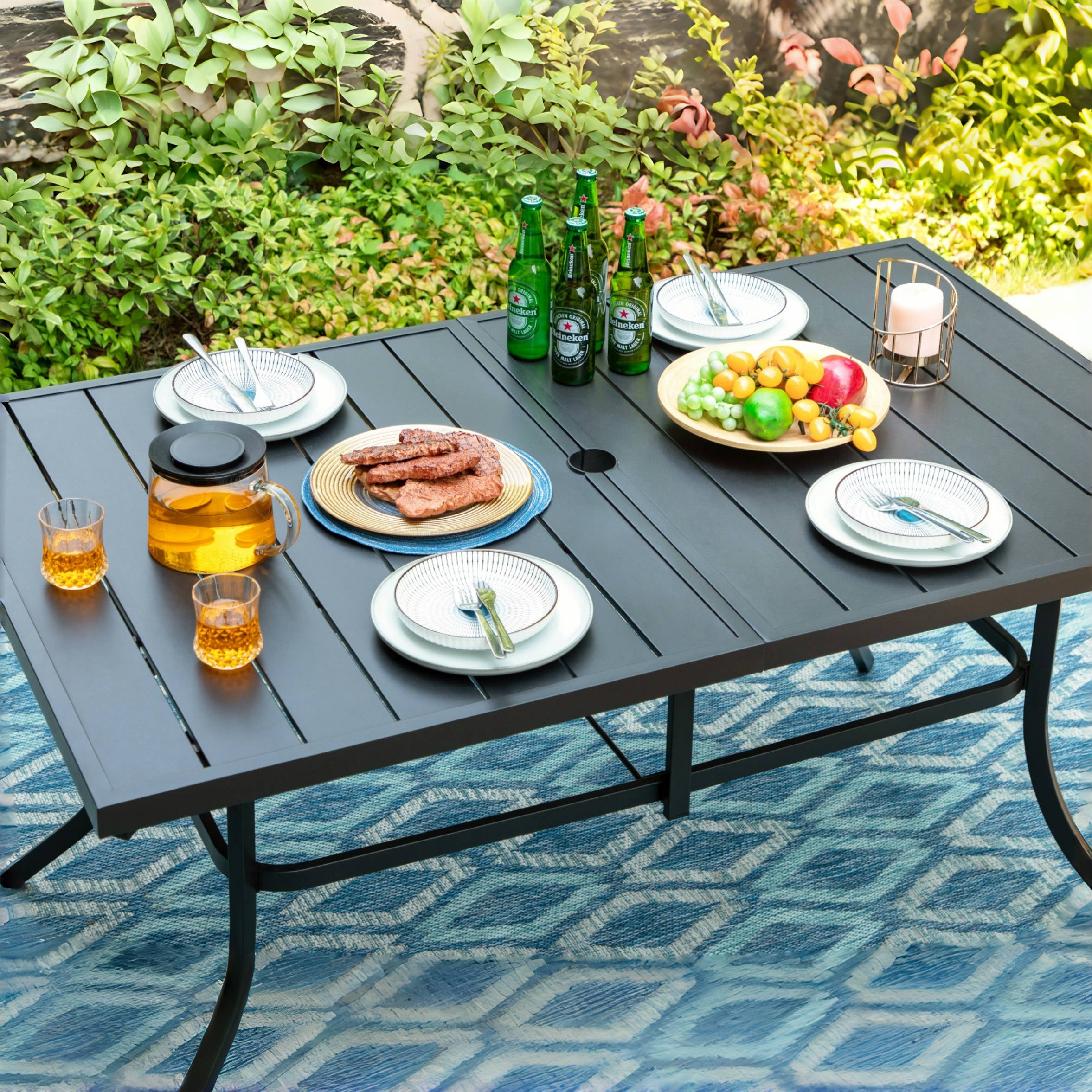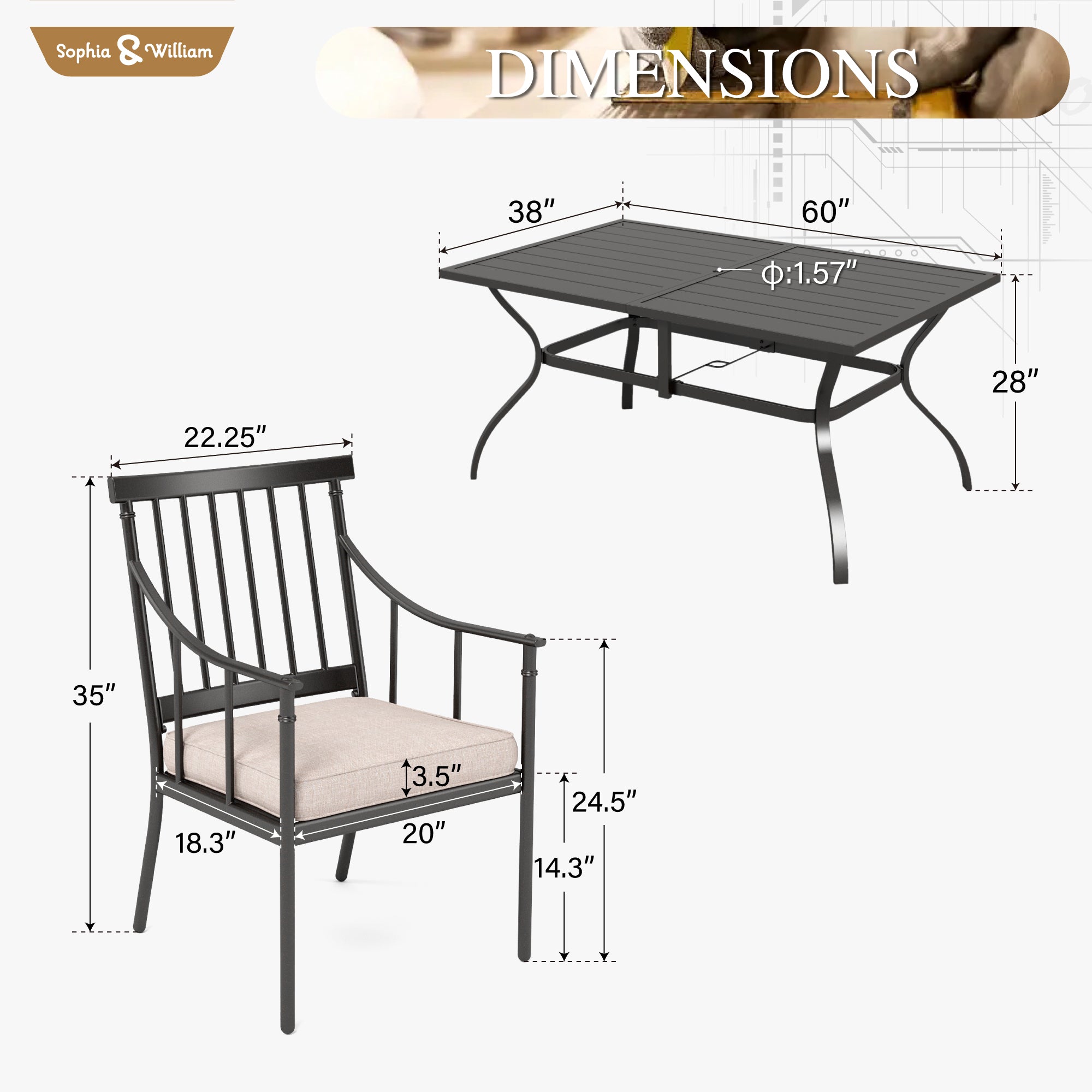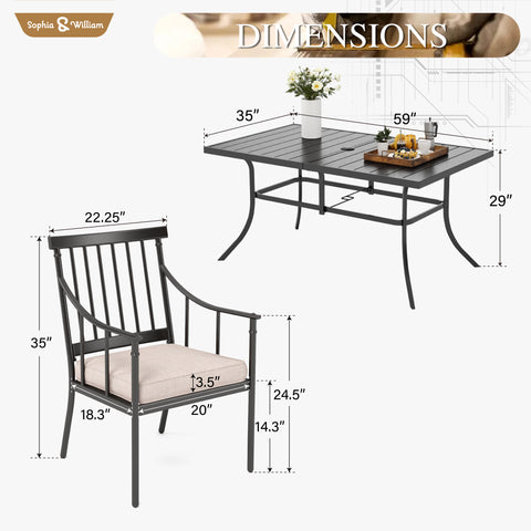 Upgrade your outdoor space with this stylish 7-piece dining set, featuring a durable steel table and six cushioned armchairs. Weather-resistant materials ensure long-lasting use, while curved armrests and thick cushions offer extra comfort. The spacious table seats six and includes a 1.57" umbrella hole—perfect for backyard meals and patio gatherings.