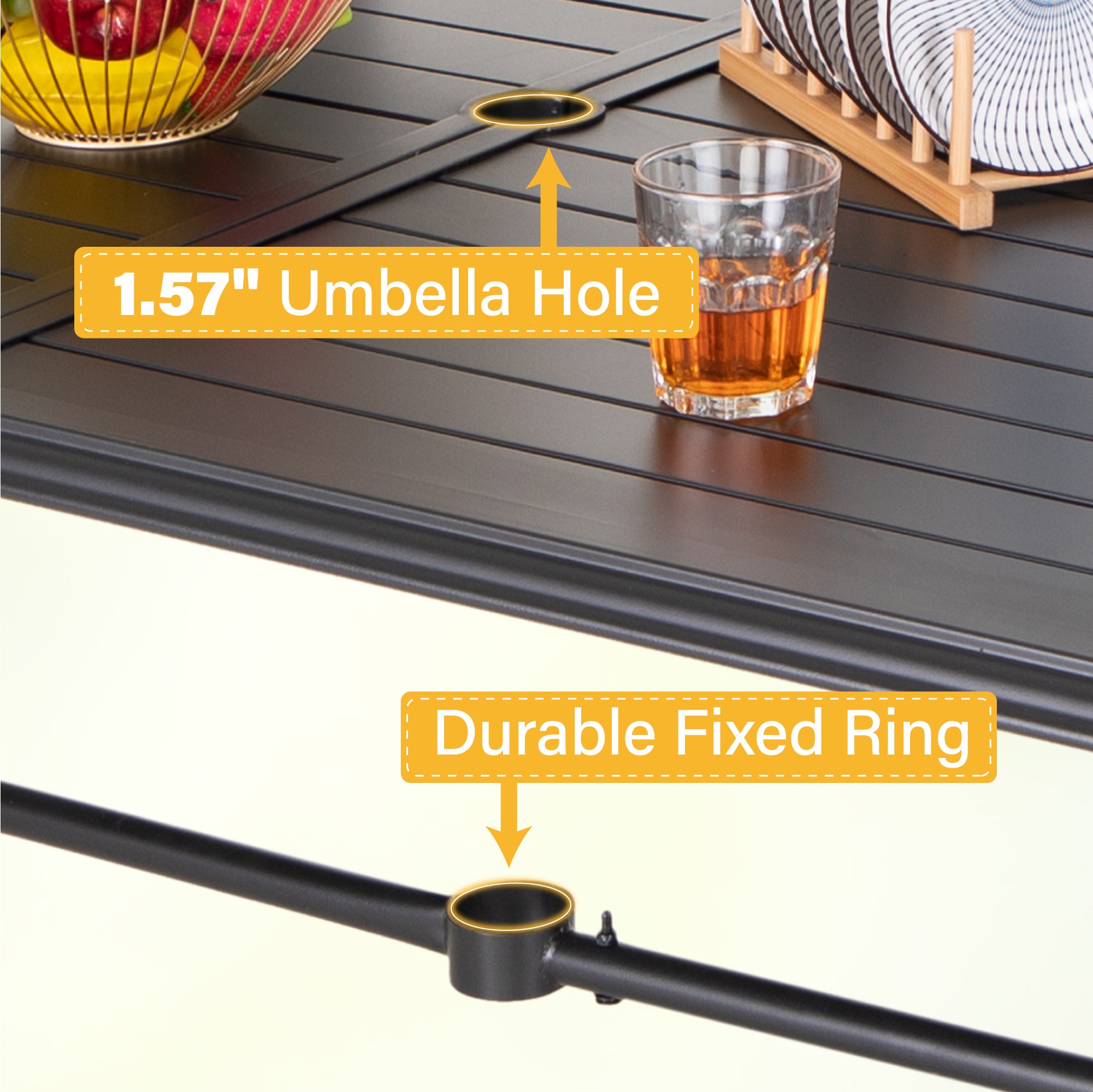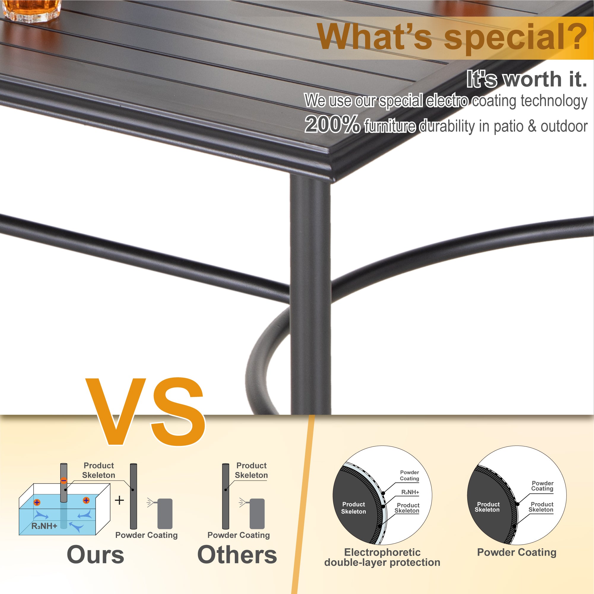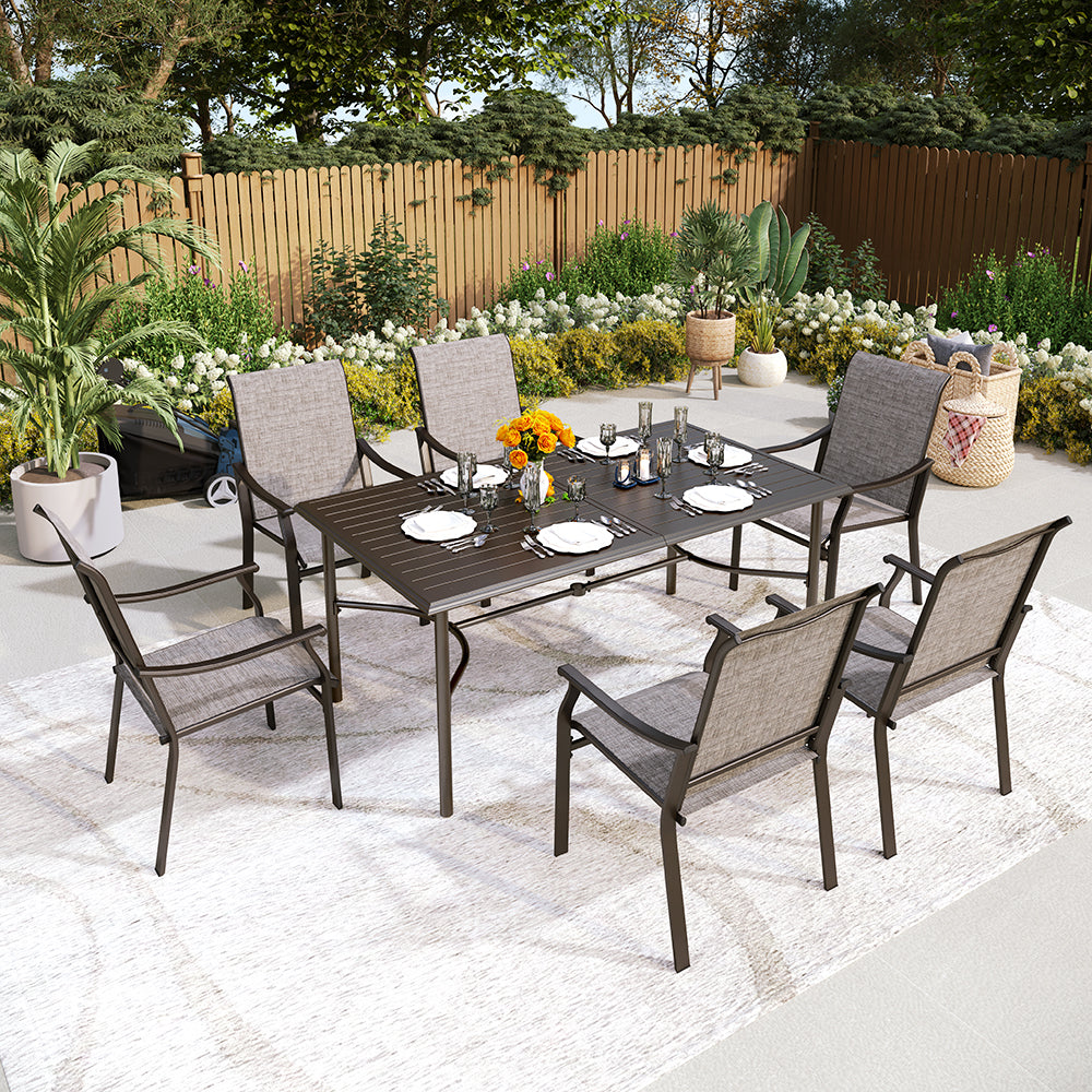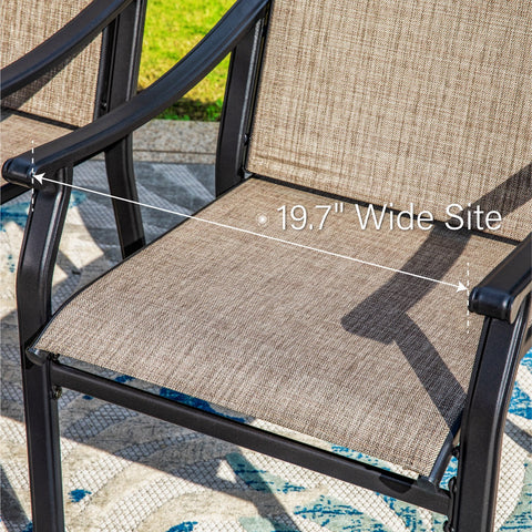 Whether hosting a dinner party or enjoying a quiet meal with your family, this ergonomic sling patio chair set elevates your outdoor experience with a perfect blend of comfort and aesthetics. Ergonomic sling patio dining chairs are crafted with comfortable, breathable sling fabric that contours to your body, providing a supportive and comfortable seating experience. The table's special bowed-bar design offers more space for your legs to stretch meanwhile distinguishing this table from other regular rectangle tables.