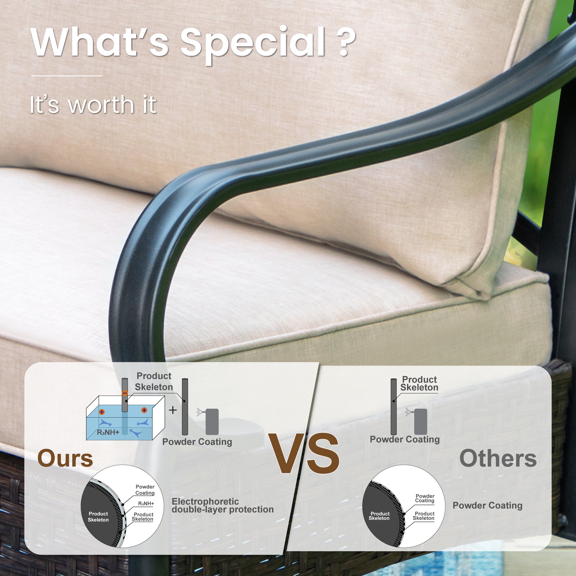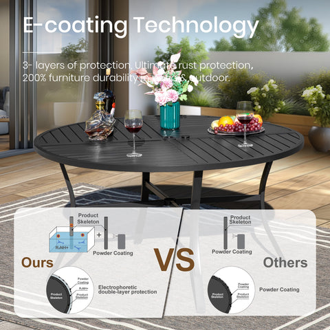 Introducing our outdoor dining set to bring you the ultimate outdoor dining experience! This table and chair set uses advanced electronic coating technology to be rust-proof and durable. The table surface has a special joint pattern and features a 1.75" umbrella hole. The chair is made of rattan and steel. The chair can also rotate freely 360° for greater flexibility.