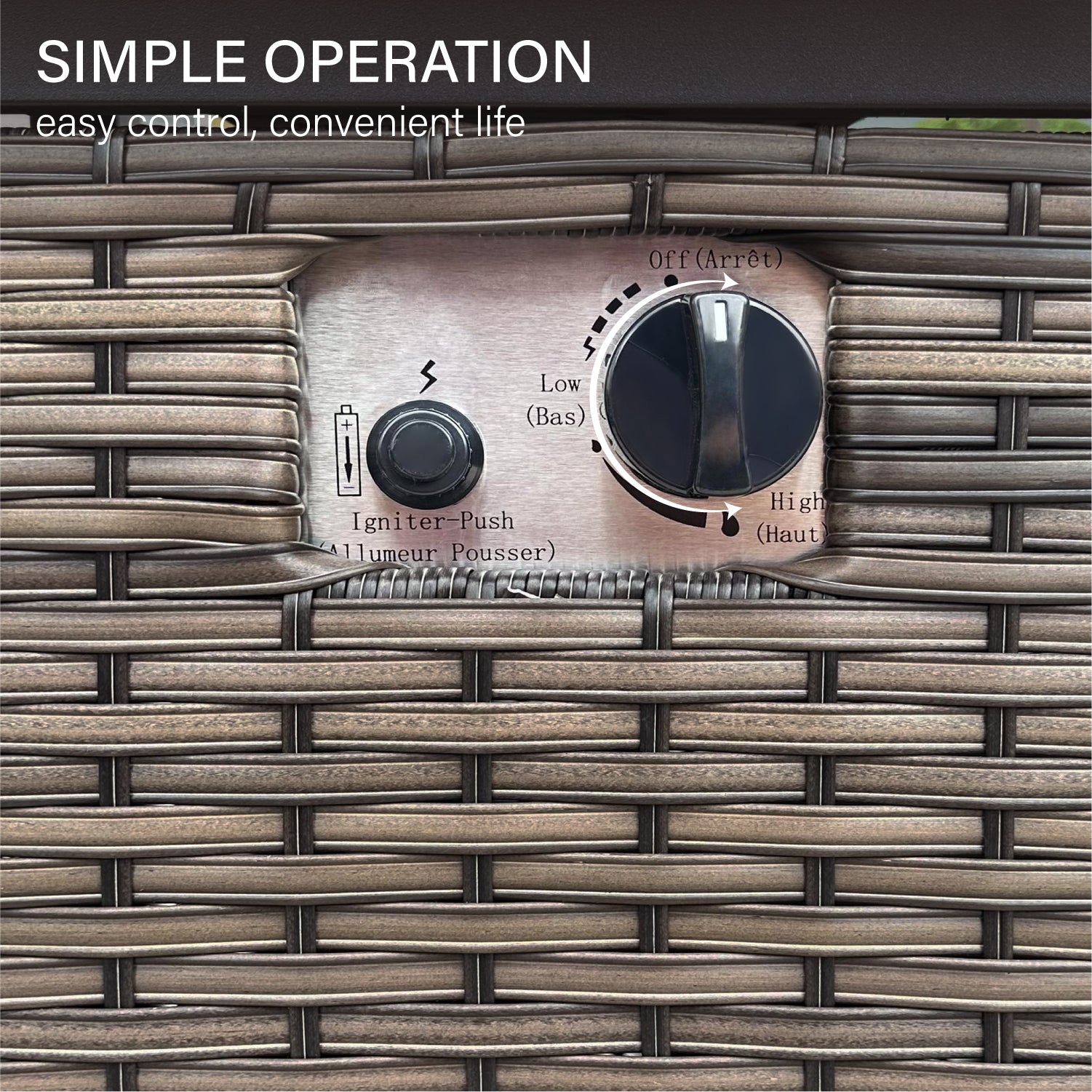 Seat cushions are filled with deform-resistant high-density sponges. Water-resistant cushion covers ensure easy cleaning and maintenance, enhancing your outdoor living experience with style and functionality. The 50,000 BTU fire burner offers a smoke-free, ash-free real fire, perfect for creating a romantic atmosphere outdoors. PE Rattan adds a natural touch to the design without compromising durability.