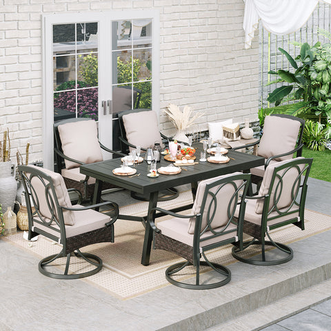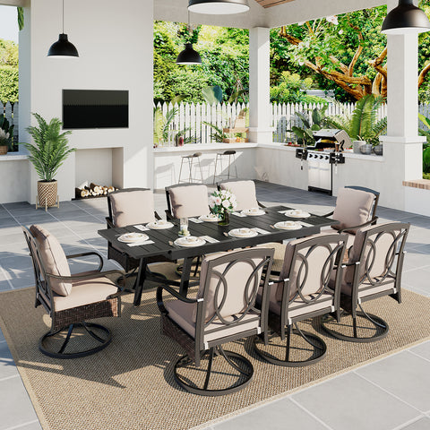It is a perfect choice for entertaining or unwinding in a sophisticated atmosphere in your outdoor space. Thicker cushions, and wider and deeper seats for a unique sitting experience. Anti-UV and water-resistant fabric for easy care. The elegant design with sleek lines and decorative rattan enhances the outdoor space's visual appeal. Versatile extendable table for gatherings of different sizes, adjusting effortlessly from 6-seater to 8-seater.
