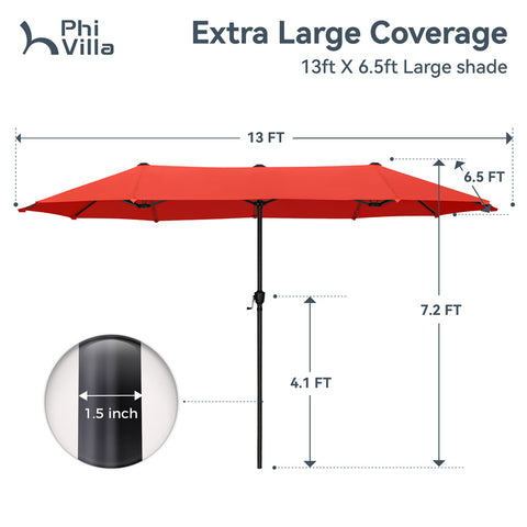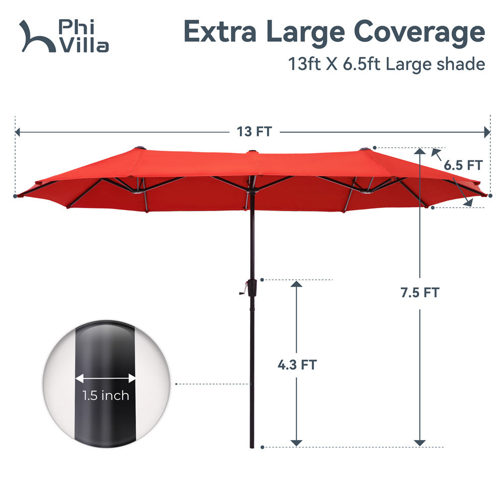 • Umbrella: 13 Ft * 6.5 Ft; Pole Diameter: 1.5"