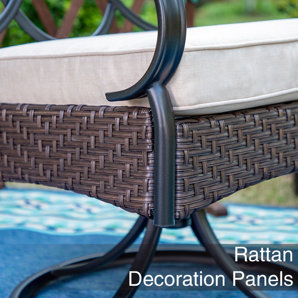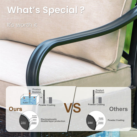 Our outdoor set features 3.74" seat cushions and 9" back cushions for superior comfort. The blend of rattan, steel, and soft cushions adds durability and style. Perfect for family gatherings, it transforms your patio into a cozy retreat. A matching umbrella is included at a great price, completing your outdoor setup for any occasion.