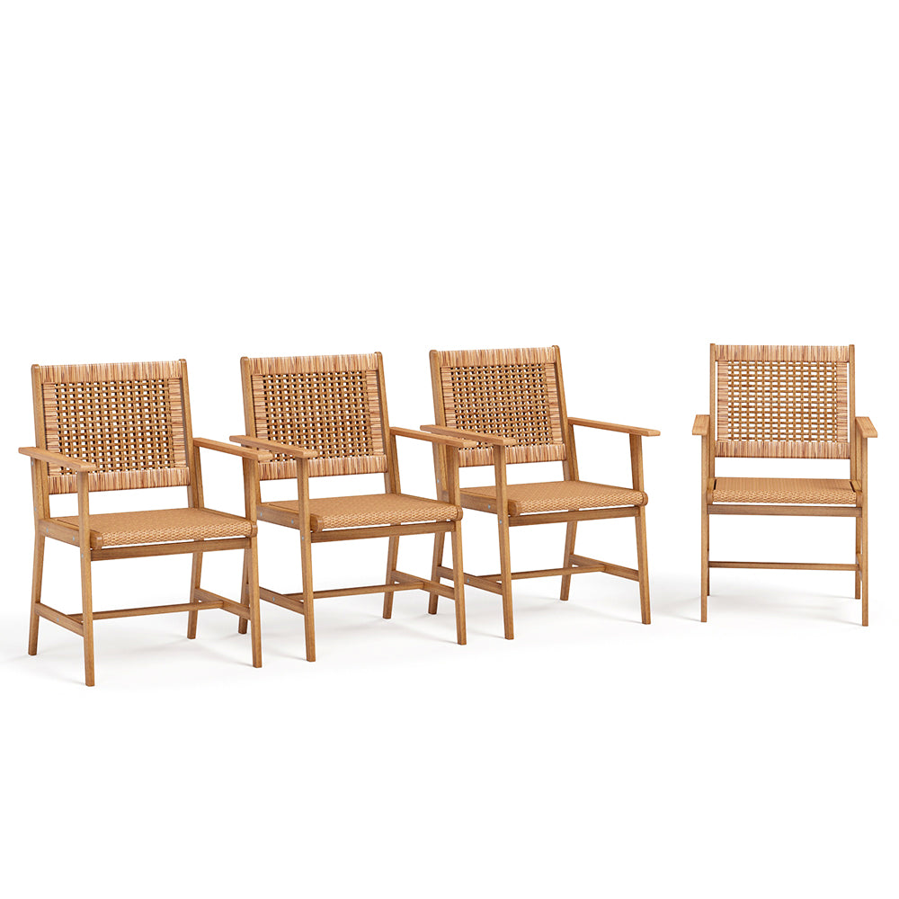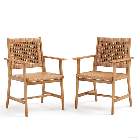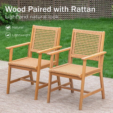 Relaxing outdoors with friends and family on our solid wood and handwoven rattan dining chair. Its premium casual design and breathable rattan seat and backrest create a comfortable atmosphere. The environmentally friendly paint enhances the wood's natural feel, protecting it from moisture and dirt. Reinforced for a weight capacity of up to 350 pounds, it's perfect for gatherings and outdoor dining experiences.