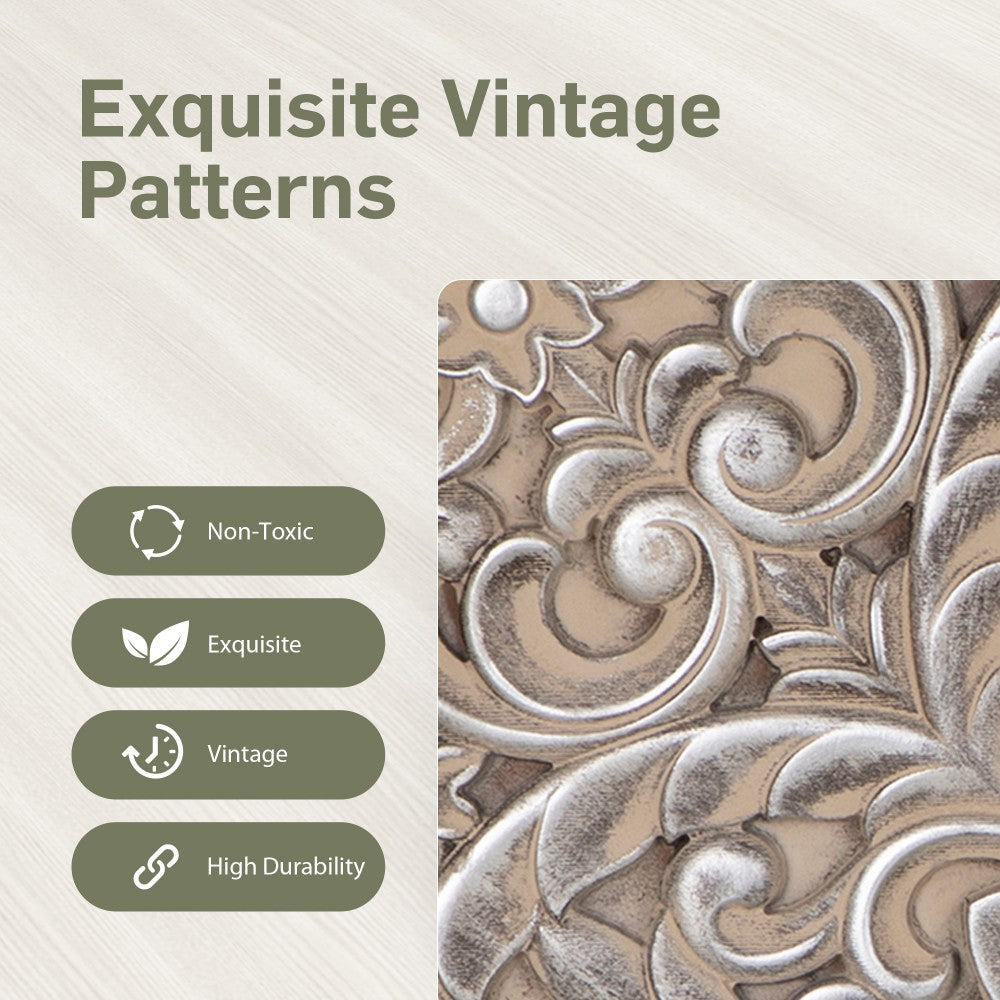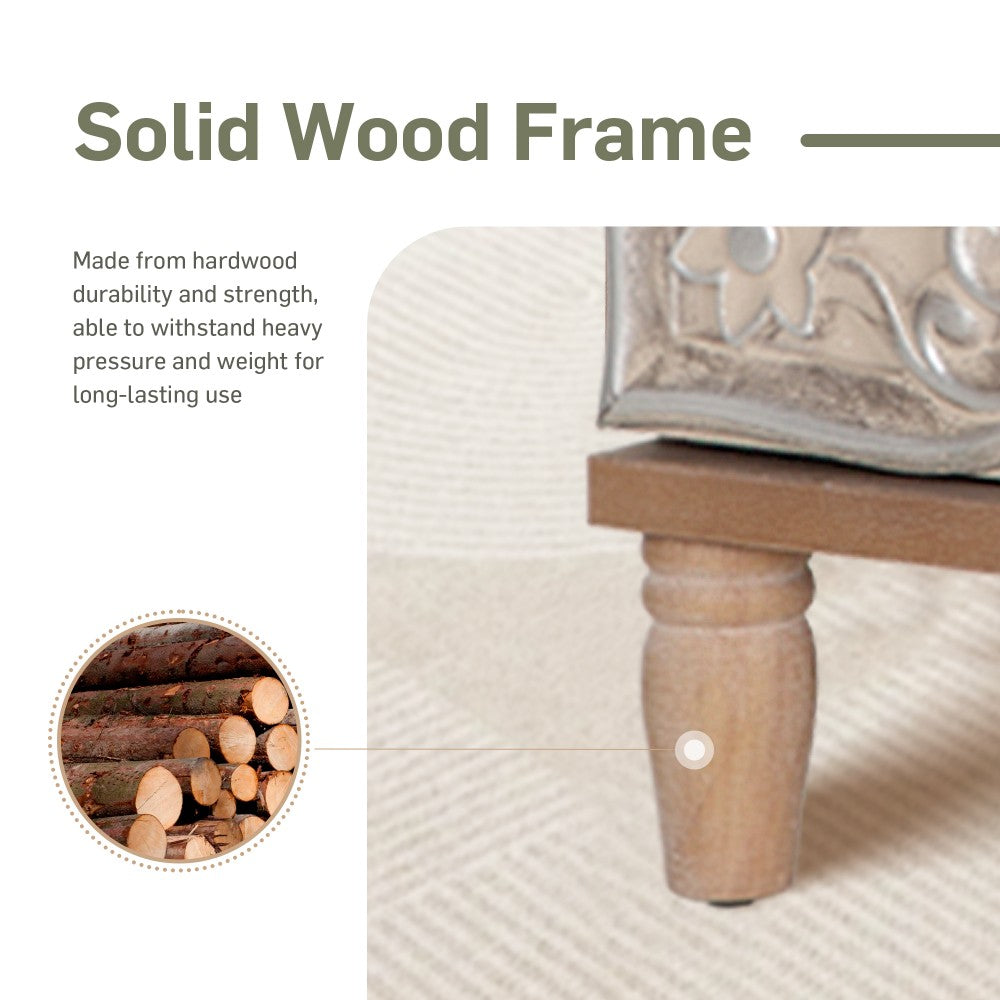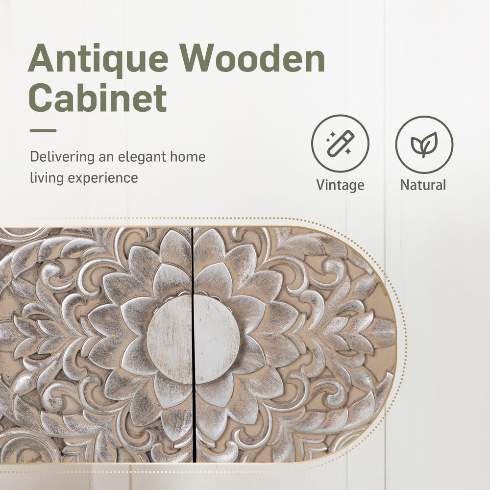 This vintage cabinet, with its carved rustic accents and silver flower design, seamlessly complements shabby chic or vintage-themed interiors, serving both functional and decorative purposes by standing out as a statement piece.
